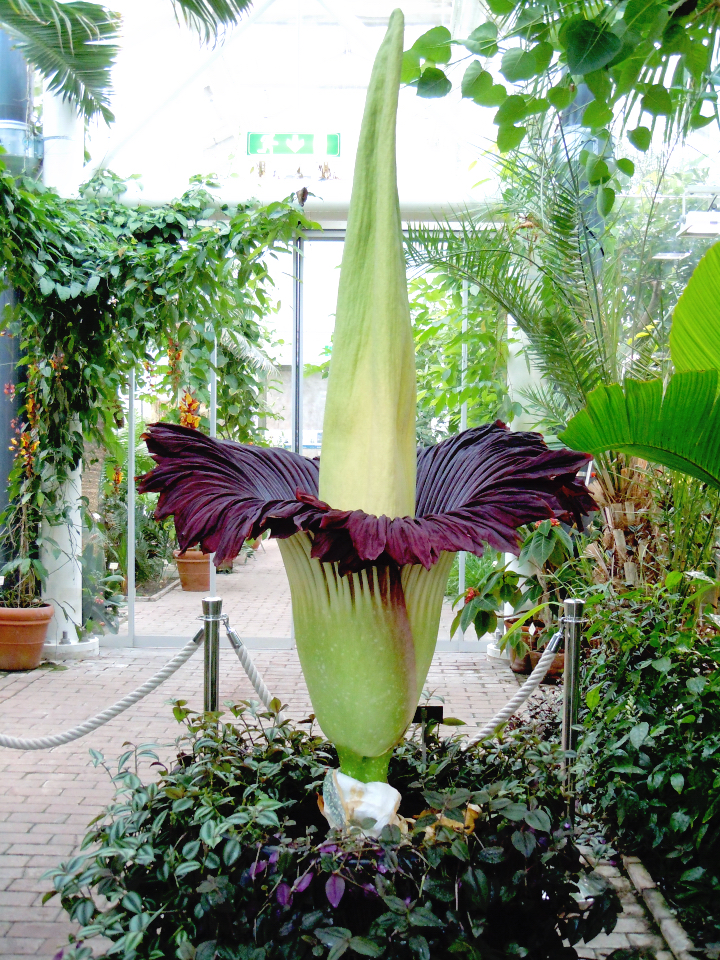 Natten till idag, onsdag, slog jätteblomman ut. Lukten första blomdygnet sägs vara förskräcklig och jag föreställde mej något svåruthärdligt. Den bruna färgen på ”kjolen” var mycket vacker, doften var inte i den värsta jag känt och många hade strömmat till för att se undret.
