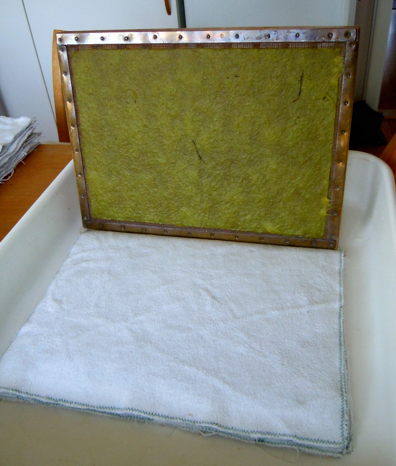 Största baljan finns kvar, ramarna och filtarna, det är bara att lyfta massan på nät ur baljan och guska. När vassmassan är slut fortsätter jag med gräsmassa och jag kan inte sluta förrän badet är utarmat.