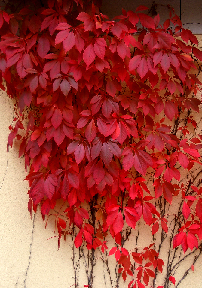 Vår garagevägg är klädd med vildvin och så här års skiftar färgen och ger oss en ny ton varje dag på väg till soptunnan.  Det går fort och Innan man hinner tröttna på färgspelet har löven lämnat väggen.