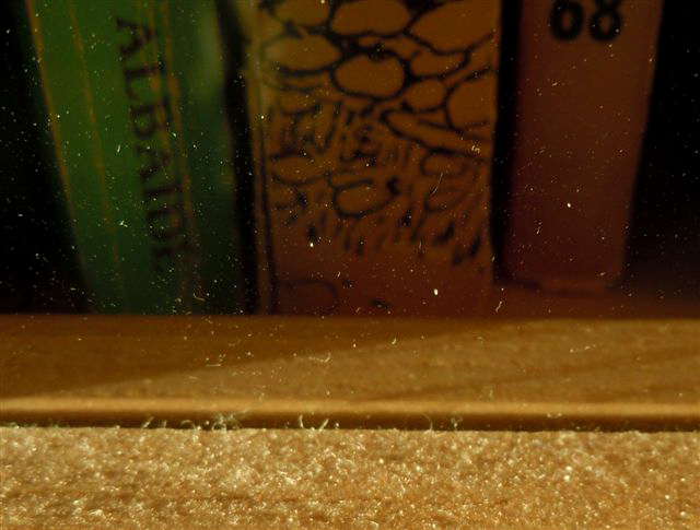 Några timmar på dagen är det lugnt men på eftermiddagen strax innan solen dyker ner i en stor björk, tar den sig in genom balkongdörren och belyser varenda partikel på golvet, ja överallt, de får ljuset från sidan, nästan underifrån så att dammet ligger fritt ovanför golvet. Den synen återuppväcker min skräck för att verka ”lortaktig”, jag kände av den senast i mars när samma lågvinklade sol hälsade på.