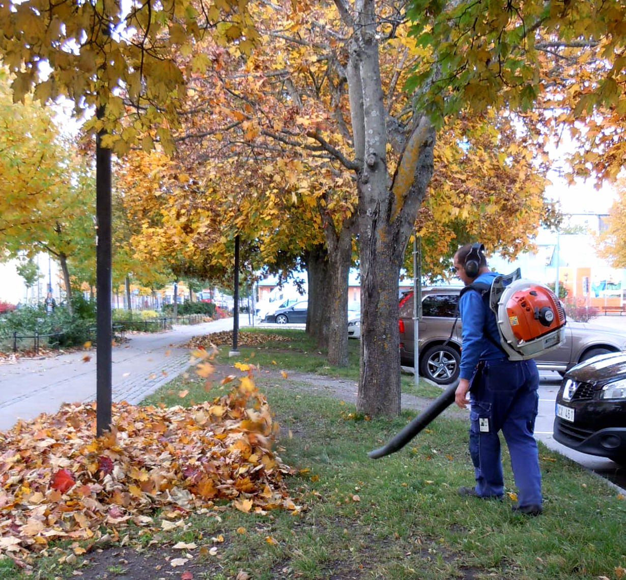 Med ett helvetiskt ljud springer lövblåsaren kring och föser ihop löven som om om det blåser lite, virvlar iväg åt något annat håll.