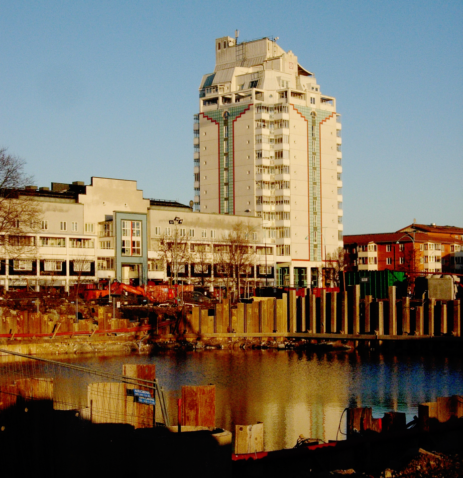 November 2009, tomten där nya gymnasiet ska byggas, ett vattenfyllt hål med minst två våningar ner till botten. Det förra gymnasiet, Vilundagymnasiet, fick stängas på grund av grundvattenskador som inte var realistiskt att reparera. Vad kan man ana av de här vattenmängderna? Nu står en  nytt gymnasium, Messingen,  på plats klätt i brun färdigrostad plåt .