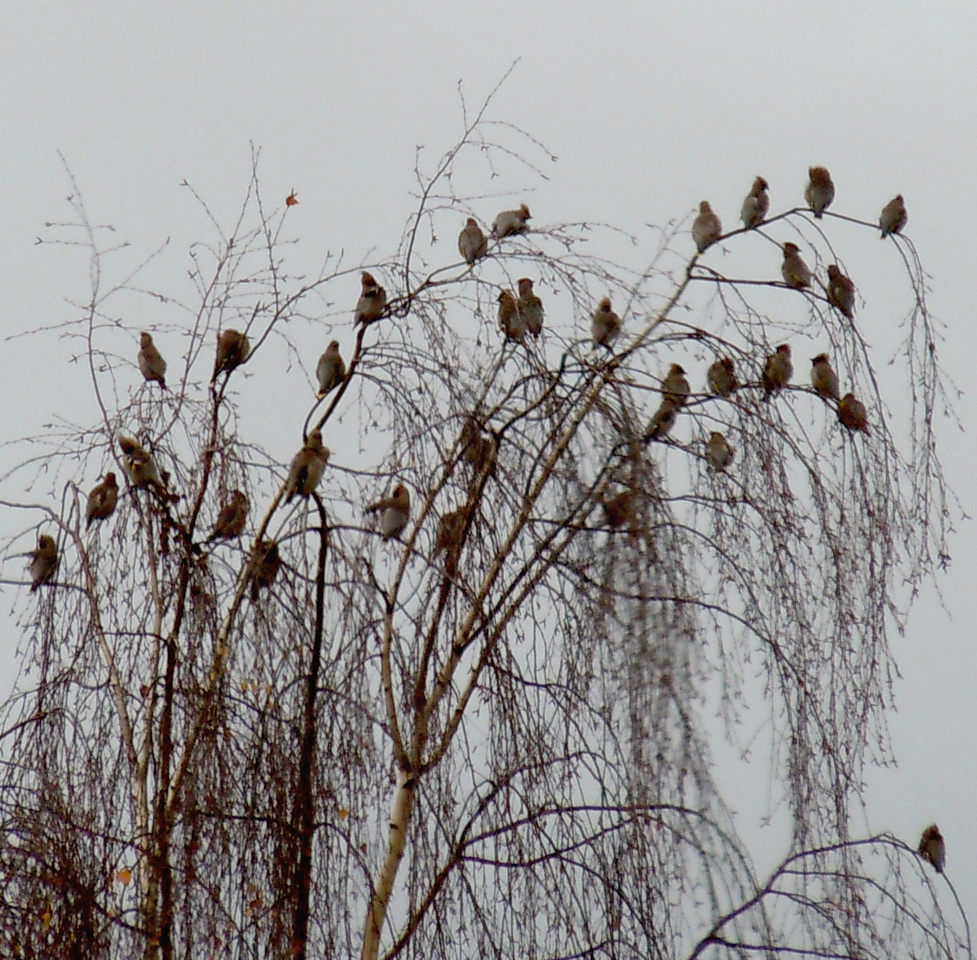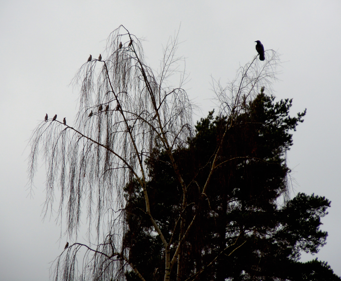 En liten runda till biblioteket, massor av fåglar trängs i en björk, vad är det – kajor, rätt stora fåglar – eller är det något annat? Det jag inte ser från marken ett par hundra meter bort, ser jag när jag drar upp bilden hemma, det är sidensvansar