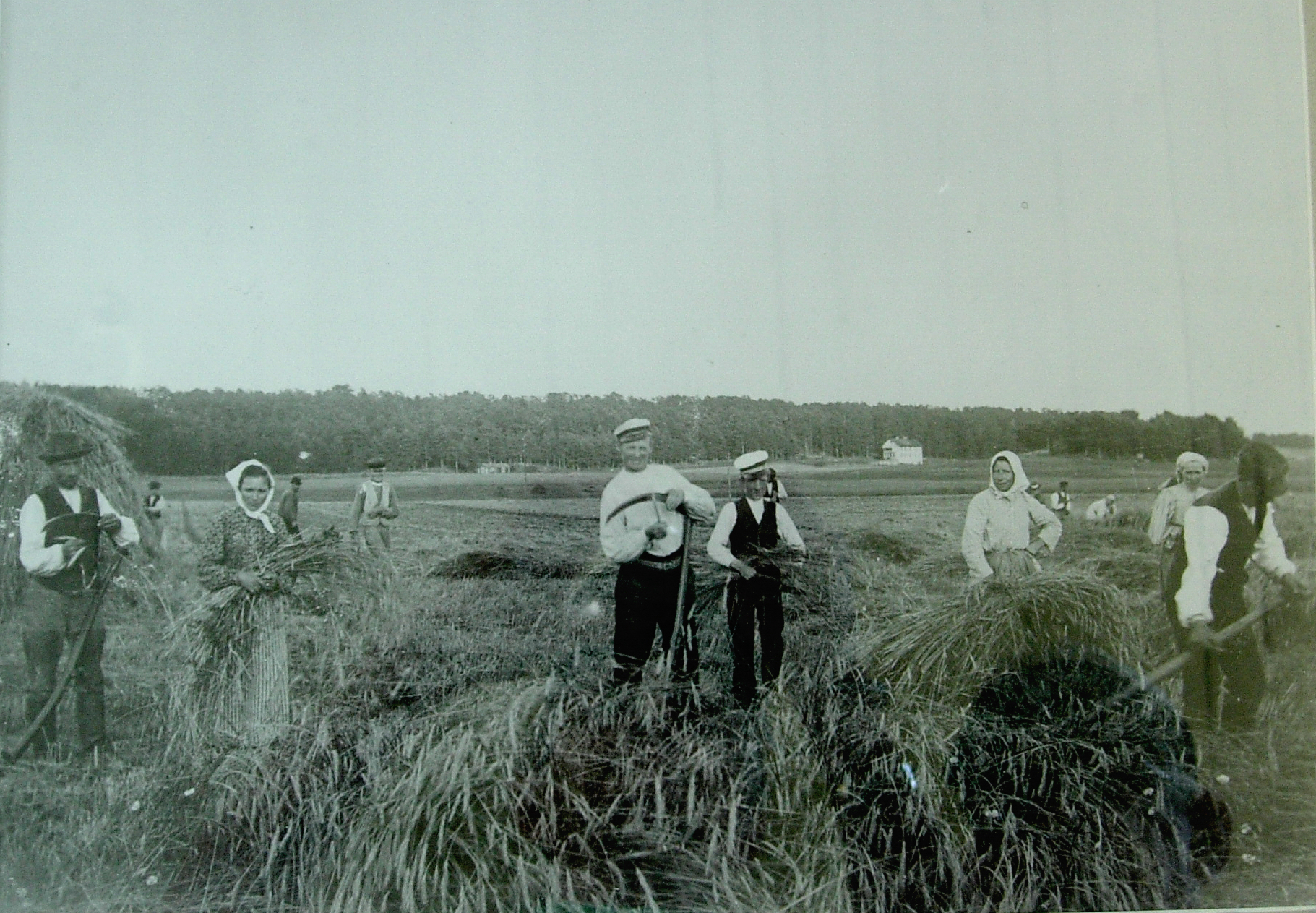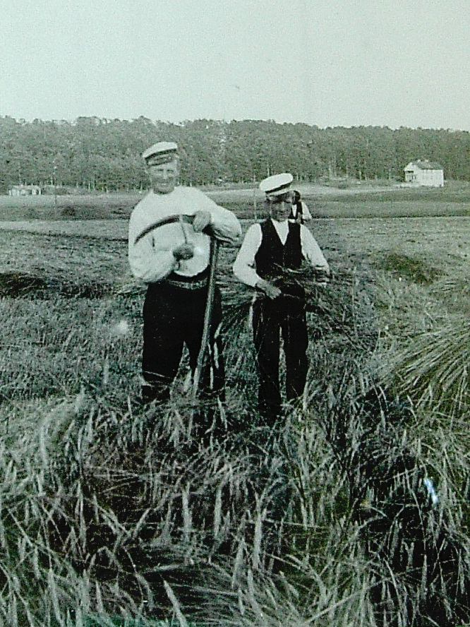 I Överjärvas Hästskokafé hänger bilder från förr på en vägg, utlånade från Solna Hembygdsförening och där finns också en fin modell på hela gårdens alla hus och odlingar, den står tyvärr i ett hörn utan belysning. På väggen hittade vi Lasses pappa Kalle  med sin far på en bild från 1903. Det gav hjärtklappning och avståndet till pappans barndom krympte som i ett trollslag. Det är en skördebild och det är råg (?) man skär med lie och pappan vässar just sitt blad med ett bryne och man kan nästan höra den  sträva klangen av sten mot stål. De är många på bilden, flera karlar skär säden och fruar, barn och pigor samlar in strån.