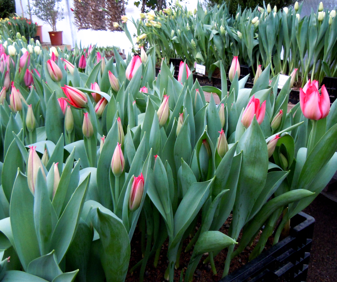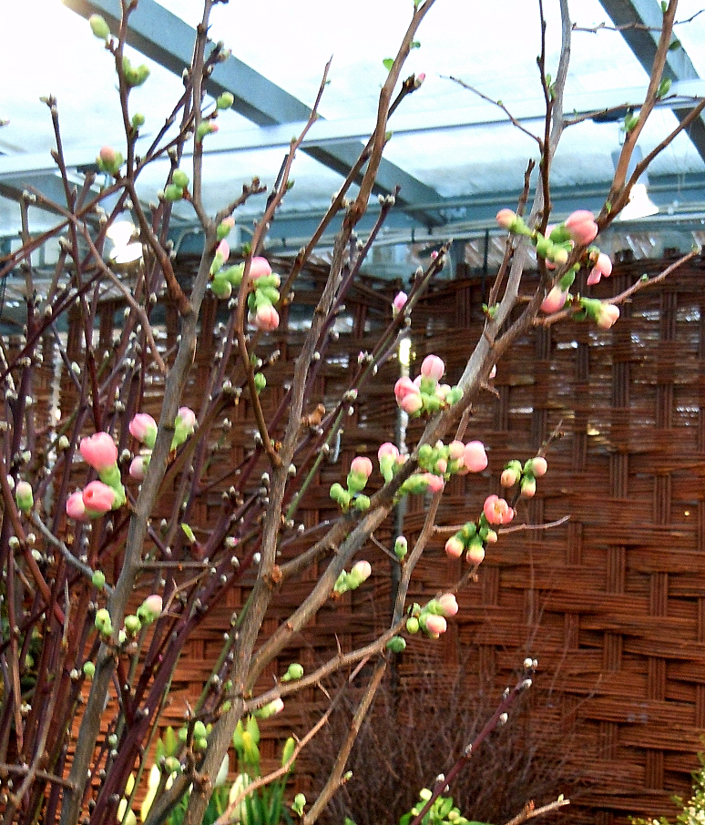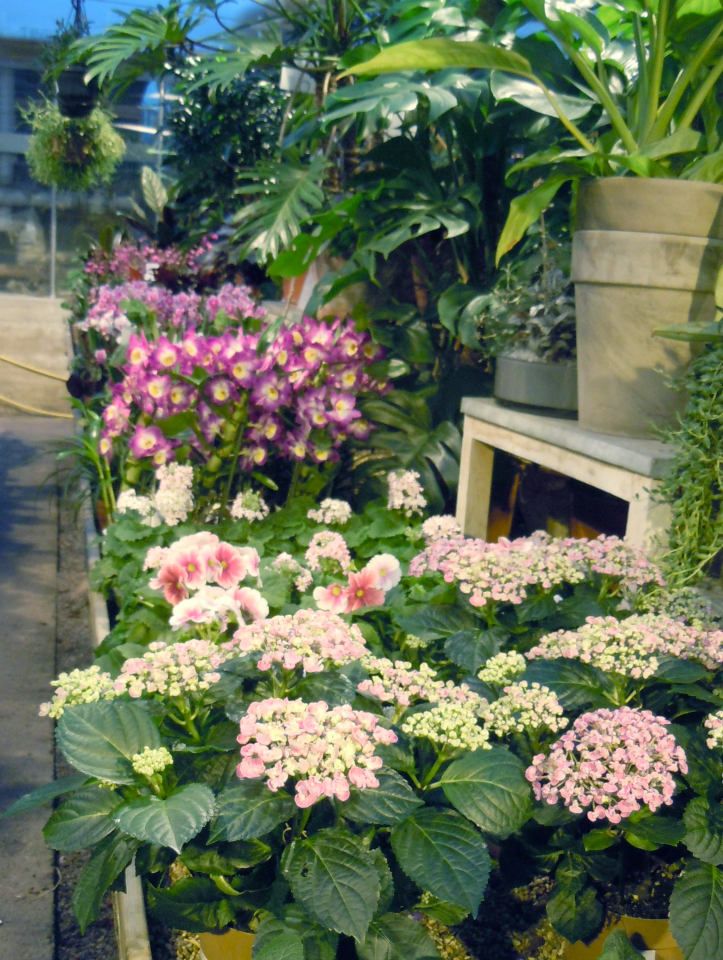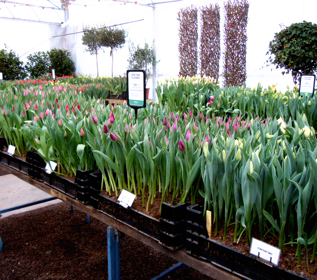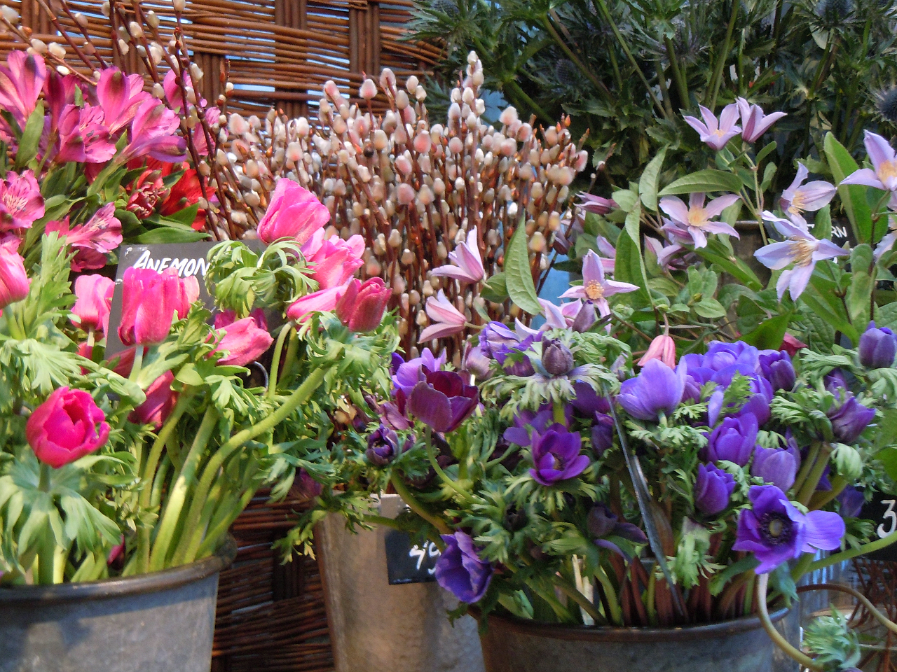 I det kalla förrummet trängs knoppande och blommande grenar med vårens groende lökar i tusen krukor och med hinkar fulla av blommor där färgen väller över kanten.