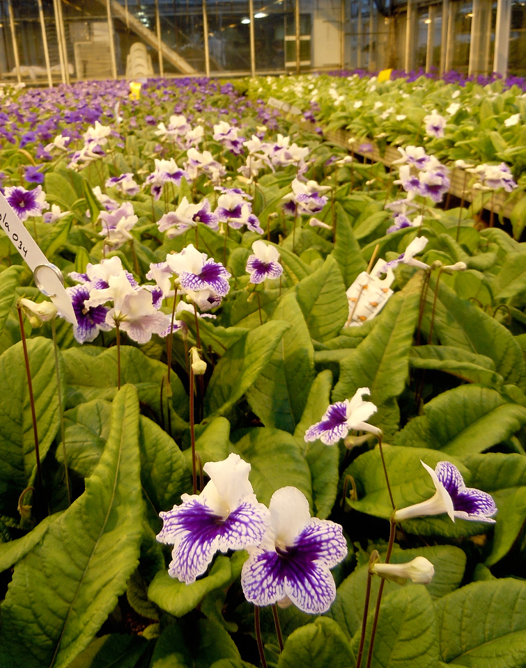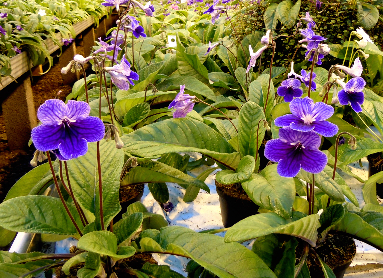 I orangeriet som är svalare hänger citroner och apelsiner och övervintrande rosmarin och sådant man frestats att ha i sitt fönster men som behöver lite kallare för att inte torka ut. På väg till kaféet passerar man odlingar och igår var det Streptocarpus, Kornettblomma för hela slanten.