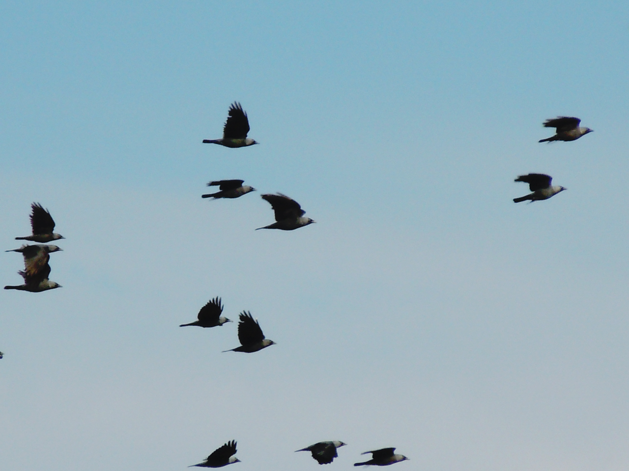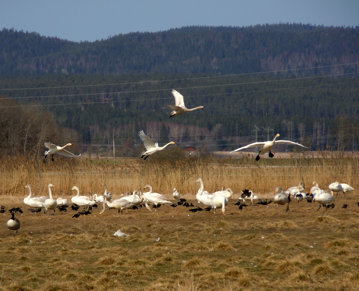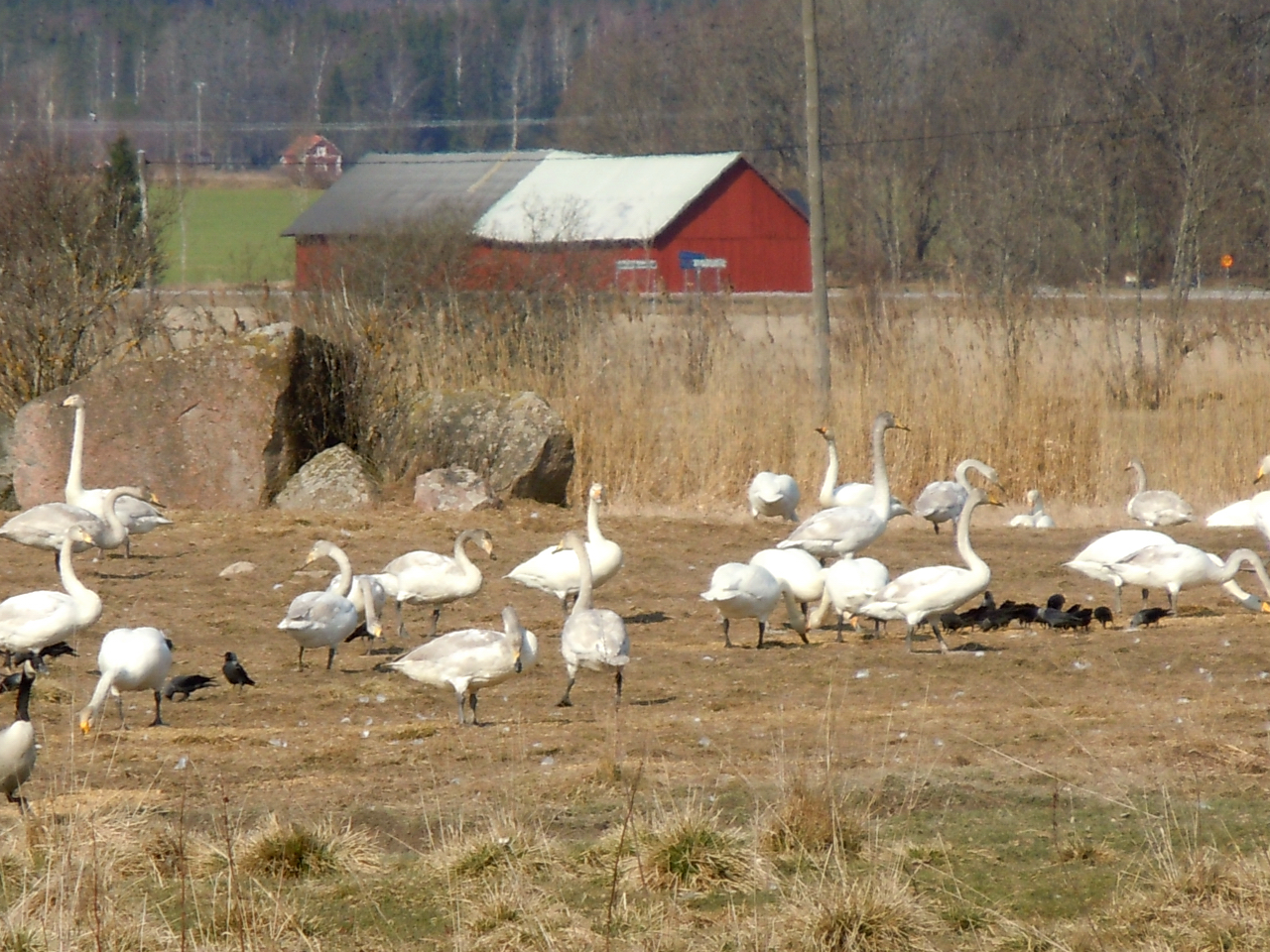 Efter en del irrande tog vi oss till Rånnesta vid norra änden av sjön Tysslingen och när vi närmade oss såg vi på långt de vita fåglarna dels ute i vattnet och dels på land. En stor flock av kajor hade flyguppvisning och stod för stora lyft och landningar bland svanarna och i de ännu nakna träden runtomkring.