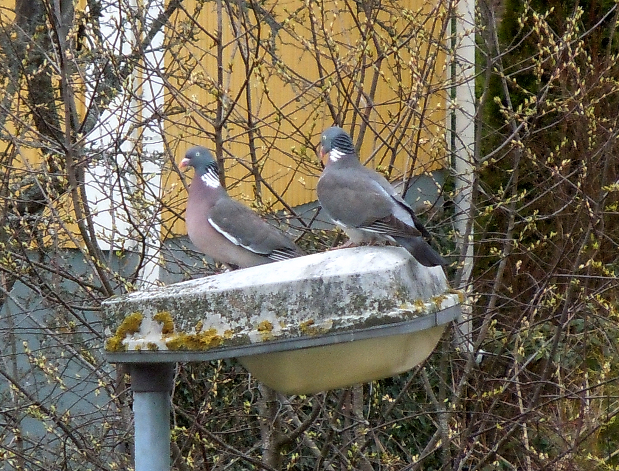 Från vårt sovrumsfönster kan vi se olika fåglar landa på den lindrigt rena gatlyktan. Den här duvan med sin kompis har vi sett som ett par mörka spolformade silhuetter i en jättebjörk längre bort en längre tid och vi visste inte vilken sorts duvor de var, men de verkar vara ringduvor.