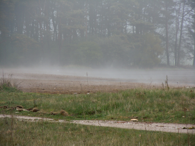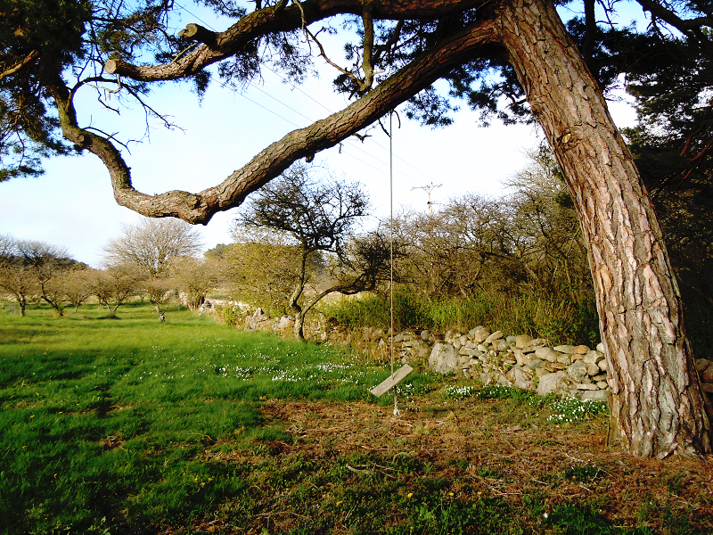 Vi hörde göken för några dagar sen och även idag, en näktergal sjöng i går kväll och en koltrast sitter på el-ledningen och drar en intrikat välljudande låt, en kritvit-kolsvart flugsnappare far fram och tillbaks mellan enbuskarna och de två sädesärlorna som vi tror bor i skorstenen trippar kring i gräset medan jag då och då rycker åt mej kameran för att försöka få dem på bild men utan resultat. Kaninerna är inte så många än men man ser deras vägar tydligt i gräset.