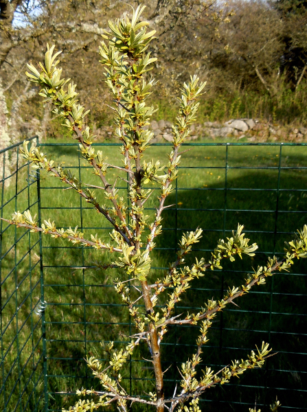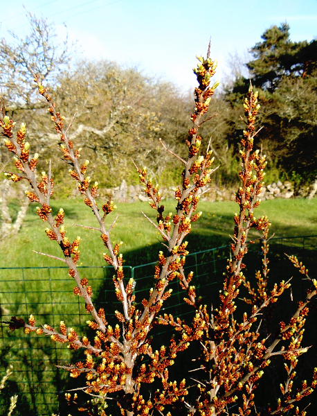 Havtornsbuskarna har klarat sej från att bli nergnagda och ser livskraftiga ut, vi hoppas att Romeo och Julia ska komma med mycket bär frampå höstkanten. Romeo till vänster och Julia till höger.