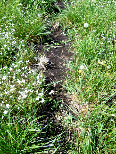 Man följer diket, det blir fuktigare och fuktigare och jorden är svart, där den är bar kan man sätta fötterna och då går det lite fortare.