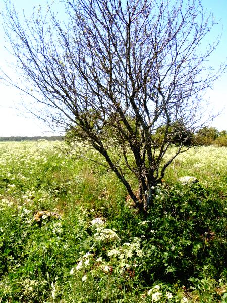 Öppningen i stenvallen är 2.5 meter bred och ligger i Sydöst. Den vaktas av ett dött spökträd utan löv men det är min fantasi som skenar, trädet är en getapel och den börjar väldigt sent att grönska och har faktiskt liv.