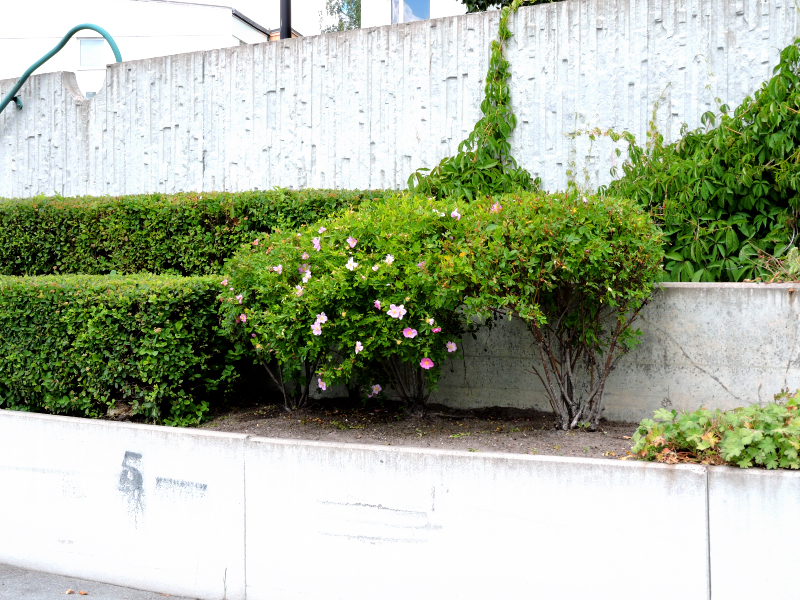 Här en rad med ”klotrosor” enstaka blommor på andra sidan.
