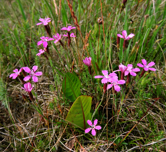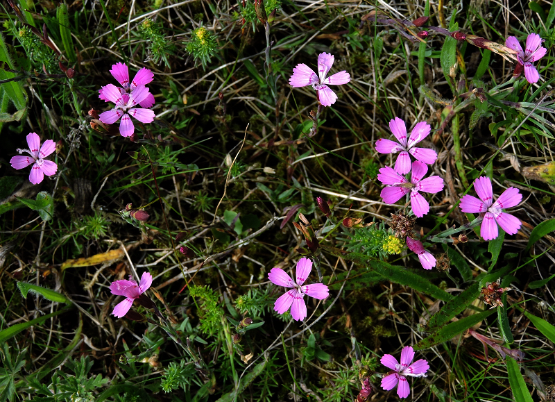 Just nu blommar små röda ängsnejlikor på den torra sandmarken utanför vårt hus, i Krok & Almquists flora kallas de också backnejlikor. De har en klarröd färg och samlas ibland många på ett ställe.