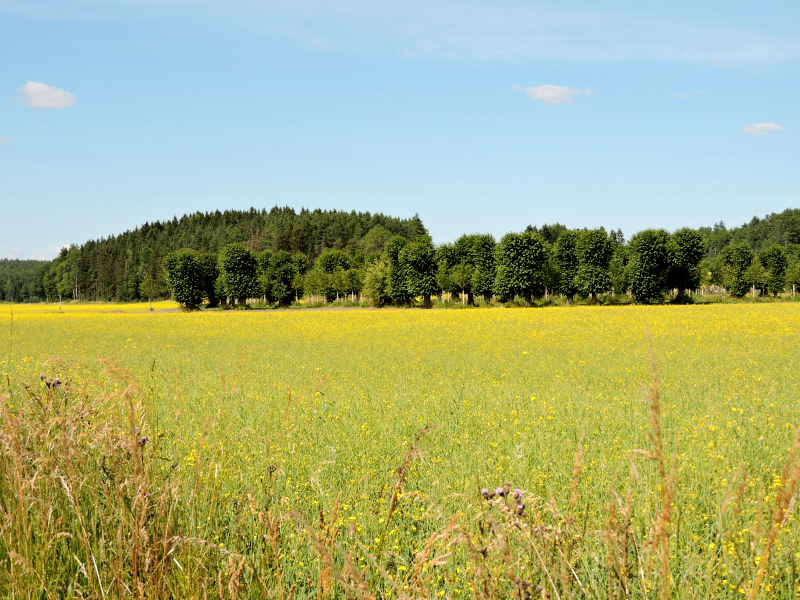 I snåret kring en ny lind lyste den röda borstnejlikan, samma som jag exporterat till vår stuga på Gotland.