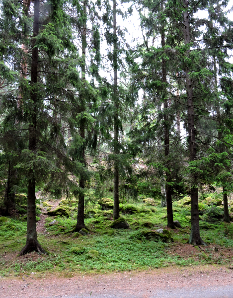 När man nu bor i en tätort får man nöja sej med den vildmark som ändå blivit kvar och där finns ibland mycket blåbär, särskilt nu i början av juli när många är någon annanstans. Vid Norra berget i Smedby är ett skogsparti sparat, gammal skog med jättehöga granar och tallar, lite mörkt är det men en gassig dag får man mycket skugga och på marken frodas blåbärsriset. Vi tog oss dit idag för att kolla framkomligheten för mopeden och för att se om det fanns några bär.