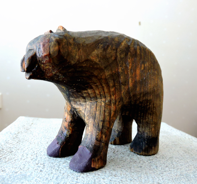 Hilma var min moster, ogift distriktssköterska, som vandrade i fjällen om somrarna på 20-30 0ch 40-talet. På den tiden hade man vandringsstav och ibland långkjol på fjället men Hilma hade oftast det som liknar ridbyxor, de pöser ut ovanför knäna. Björnen var ett minne från någon vandring i Lappland och jag såg den i hennes bokhylla under hela min uppväxt, jag tyckte inte att den var lik en riktig björn men vågade aldrig säga det och bland Hilmas efterlämnade föremål, hamnade den senare hos mej. Den blev rätt omilt behandlad av våra små barn och jag var helt okänslig för björnens skönhet, det är först de senaste tio åren som jag har sett hur fin den är. Den är mycket björn och täljd av någon som har sett och känner björnen. Var hon fick den och av vem får vi aldrig veta men hon var hemma överallt i fjällvärlden.