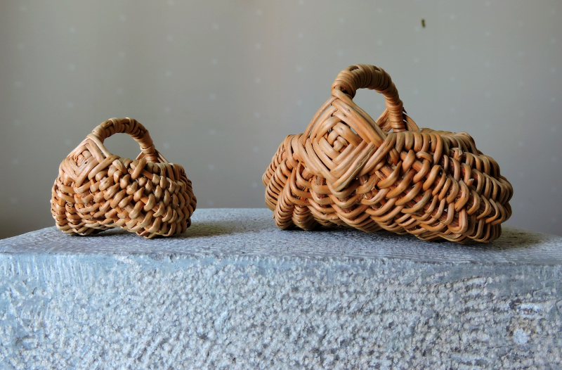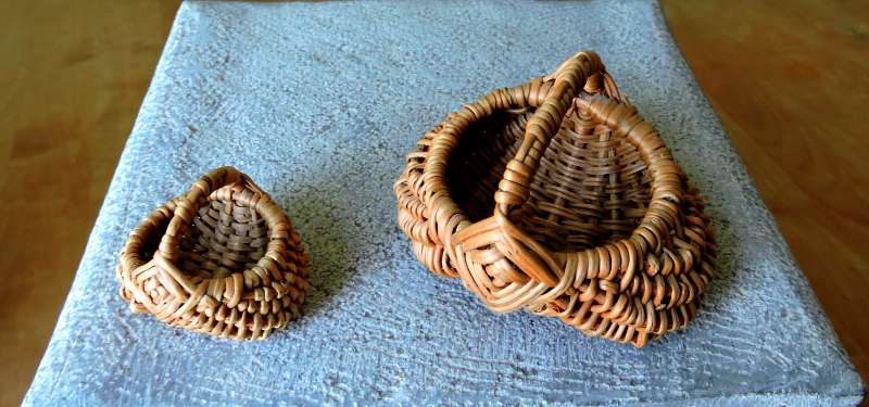 De här mikrokorgarna 4 cm och 8 cm är från tiden på Skansen, då olika hantverkare var samlade för att visa upp sej och berätta om sina hantverk. Det fanns en korgmakare som var mycket duktig och som förutom att han var slagfärdig, så svor han värre än en borstbindare. Det passade inte alltid så bra att han struntade helt i vem som lyssnade och man försökte få honom att mildra sitt ordval, men då blommade svordomarna upp ännu mer. Vi hade jättetrevligt på de här hantverkarhelgerna och vi är inte så många som har hans minsta korgmodell.