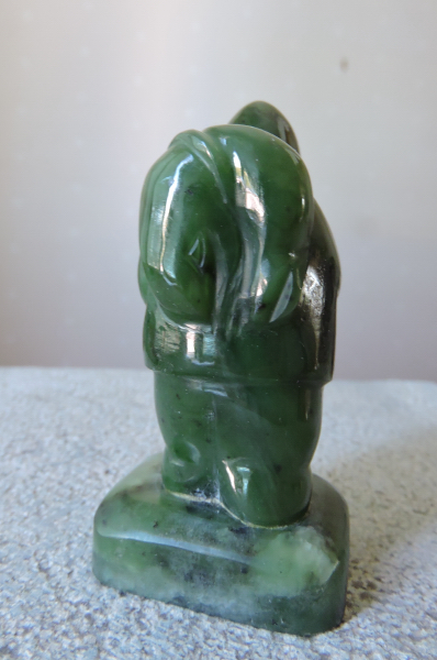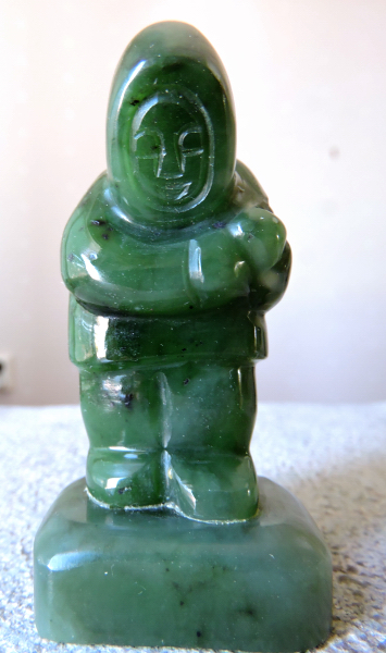 En kanadensisk inuit av jade 7 cm hög fick Lasse som minne vid ett besök hos Maia Liiv i Vancover i Canada. Maia kom som flykting från Estland på 40-talet och gick på STI samtidigt med oss. Hon levde med en ständig ryss-skräck och slog sej aldrig till ro här trots att hon hade arbete och fick många vänner. Hon bodde i en sommarstuga på en klippa i Sjöberg utan plogad väg på vintern och med en kamin som slukade tidningar som enda värmekälla. Vi hade alltid med oss alla våra samlade tidningar, då vi besökte henne. Vi lärde oss mycket om Estland den här tiden, Maia berättade och vi lyssnade. Efter några år träffade Maia en man som var något i trävarubranschen och de skulle gifta sej och flytta till Kanada. Vid avfärden från Stockholm hade alla hennes vänner samlats för att vinka av och önska lycka till. Hon tog då Lasse avsides och bad honom att ta hand om hennes cyankaliumkapsel, nu trodde hon inte att hon behövde den längre. Kanada var ett säkrare ställe att bo på än Sverige. Vi höll kontakt med brev och efter 30 år var Lasse i Vancouver och sökte upp Maia. Hon var då bräcklig men det var ett kärt återseendet och med sej hem fick han den gröna lilla gubben med en fångad säl på ryggen. Ett år senare fanns inte Maia.