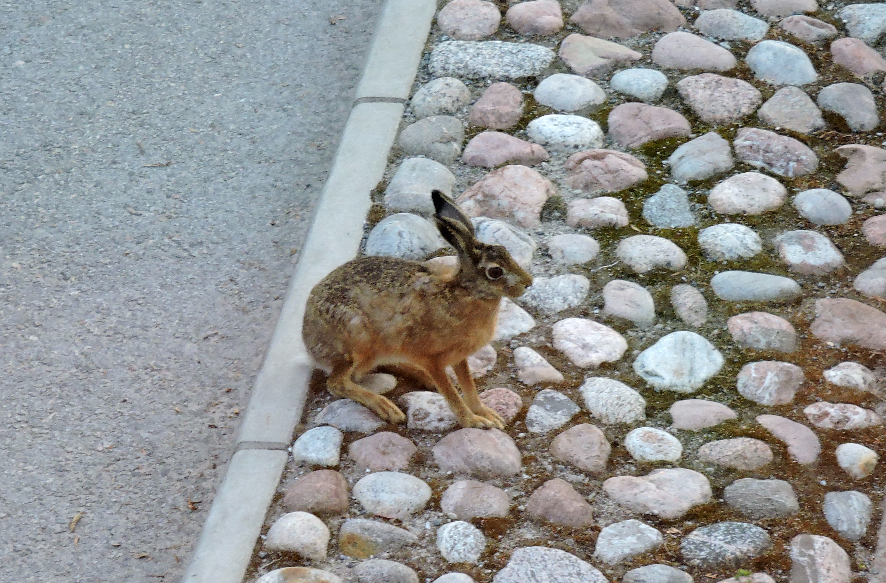 Fläkten snurrar och för att känna efter om det är varmare ute än inne går jag ut på balkongen och på gatan nedanför hoppar kvarterets hare, den gör en sväng in på vår gård och försvinner sedan ut över garagegången. Var bor den? och i vems trädgård?