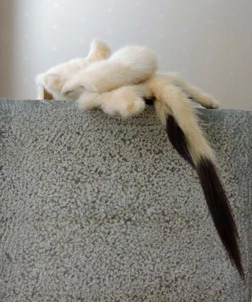 Två hermelinskinn från pälsmarknaden vid hamnen i Helsingfors på 70-talet. Vet inte om man fortfarande säljer pälsskinn från vilda djur där. Då kunde man välja,  jag tror nästan vadsomhelst och en pälskrage var ännu inte fel.