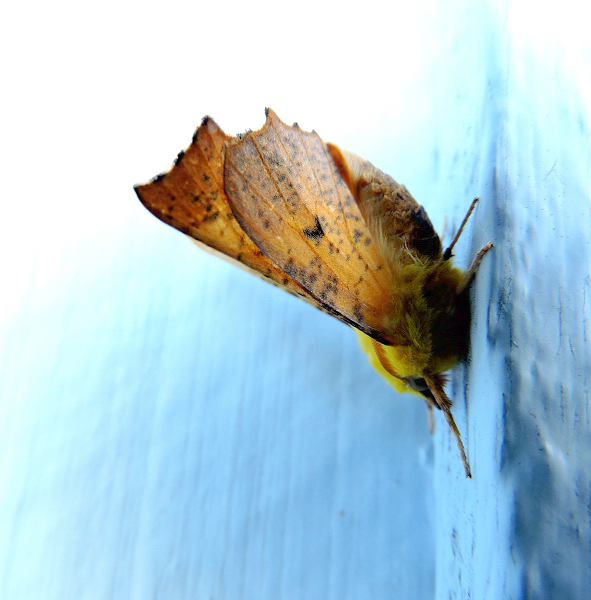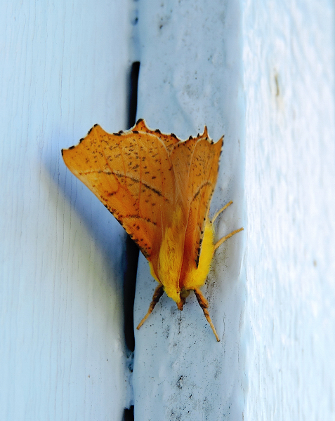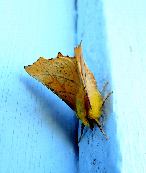 Vilken enormt läcker fjäril. Den har jag aldrig sett förut. Så fin den är med sin gula kropp och så vingarna som vissna björklöv.