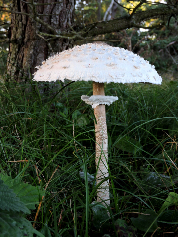 När jag drog upp gardinen i går såg jag en vit lysande prick under en liten tall på andra sidan av våran åker. Kryssade dit mellan kaninhålen och såg vad jag anat, en stolt fjällskivling som inte vecklat ut sej helt. I stället för att plocka den och fyra till fick den vänta tills den fällt ut paraplyet lite mer. De andra gick i stekpannan. Ett år var de så många att vi fick torka dem och smula till pulver att pigga upp såser med under vintern.