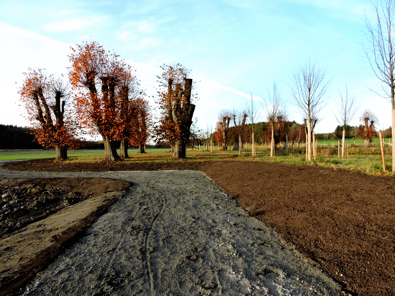 Löven har inte släppt sina fästen på de gamla lindarna och på håll är träden rostbruna. Då vi kommer närmare ser vi att man har planterat mängder av nya träd, fler än förra gången vi var här, växtligheten på marken som var störande förut, är nerklippt och man kan gå i lågskor över hela området.