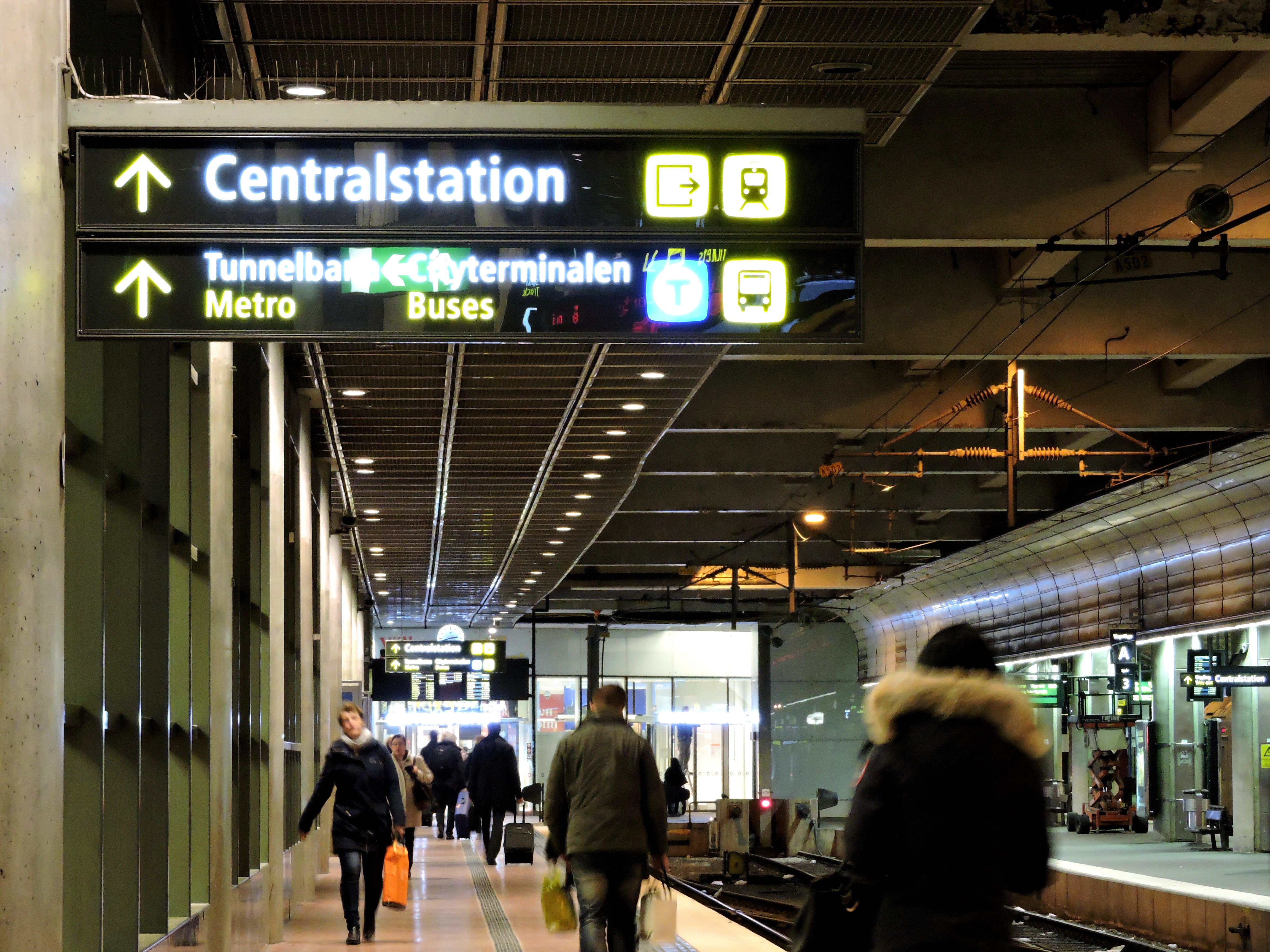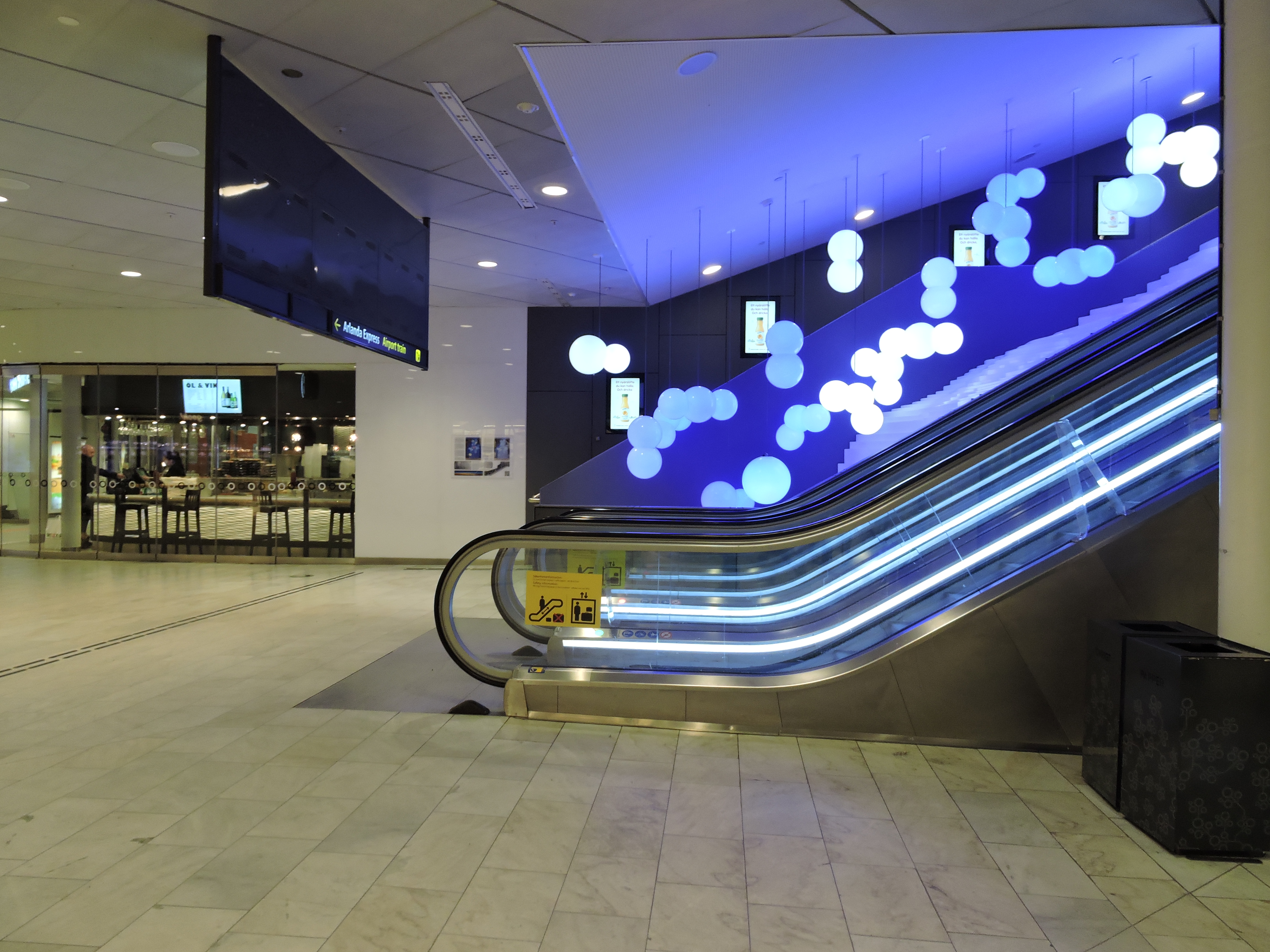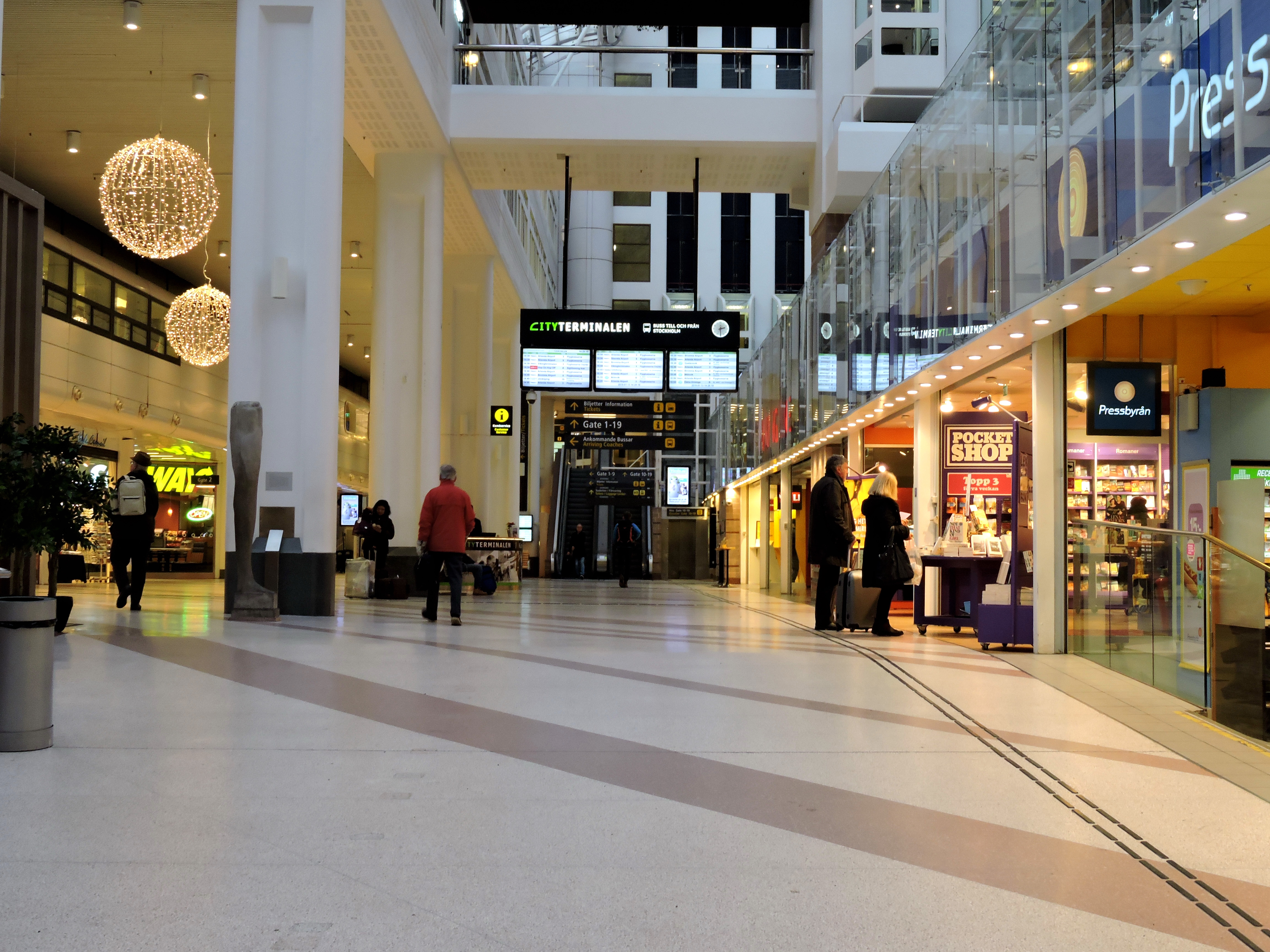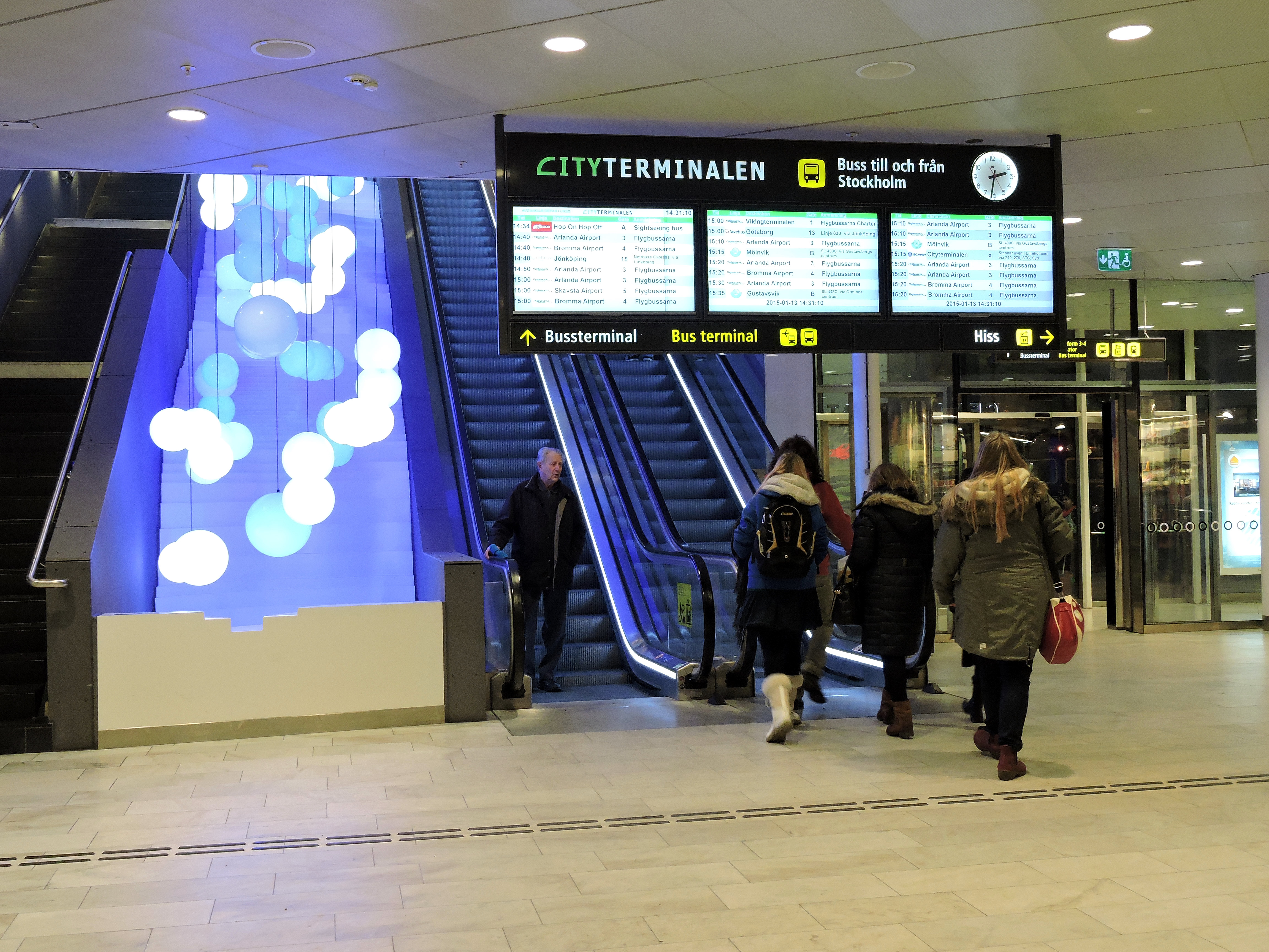 In i värmen på Centralen och till höger uppför en rulltrappa, däruppe ska bussarna finnas.