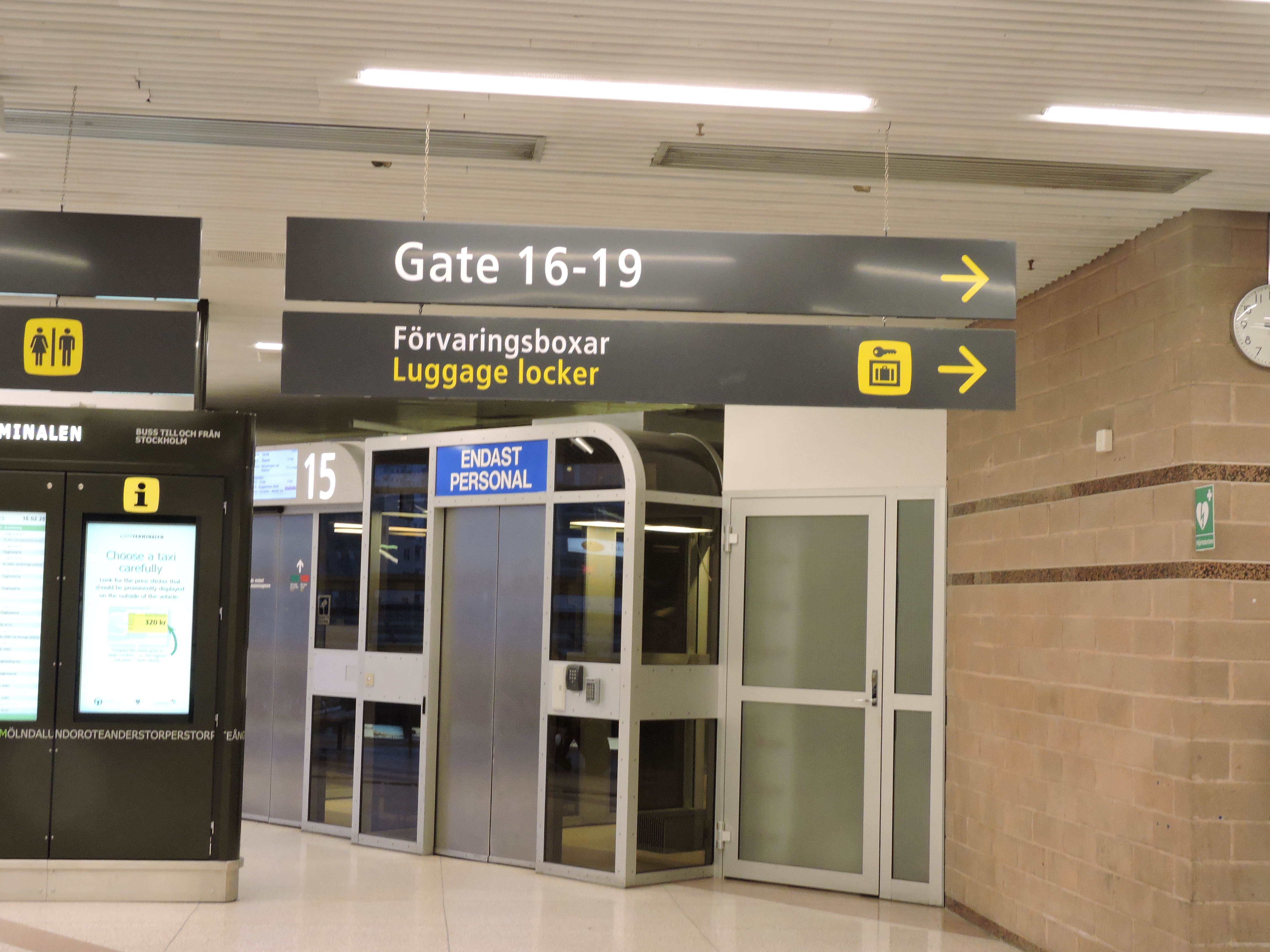 och var är bussarna? På samma plan fanns många utgångar ”gater” men de såg ut som till flygbussar, aha det är här dom kommer, men var är alla andra bussar? Måste till slut fråga.Det är rulltrappan upp rakt fram. Däruppe fanns 18 utgångar med destinationer på en liten skylt över varje. Efter att ha gått två långa korridorer läst på alla de 18 skyltarna utan att hitta Växjöbussen fanns inte en kotte att fråga, bara några trötta enstaka sovande på olika bänkar. Jo innanför ett glas rörde sig en man med mässingsknapp i kavajen, han steg igenom glaset och ropade ” Och vart ska du då?”. Jag letar efter bussen till Växjö. Mannen nappade åt sig mina busspapper och sa, ”jag ska gå och fråga bussledningen” och sen gick han igenom ett glas där det stod endast för personal och efter en evighet kom han tillbaks och sa det är gate nr 17. Där har jag varit men den bussen går någon annanstans. Namnen på destinationer kan rullas hit och dit och en stund innan respektive buss har avgångstid rullas rätt namn fram på skylten. Jaha.