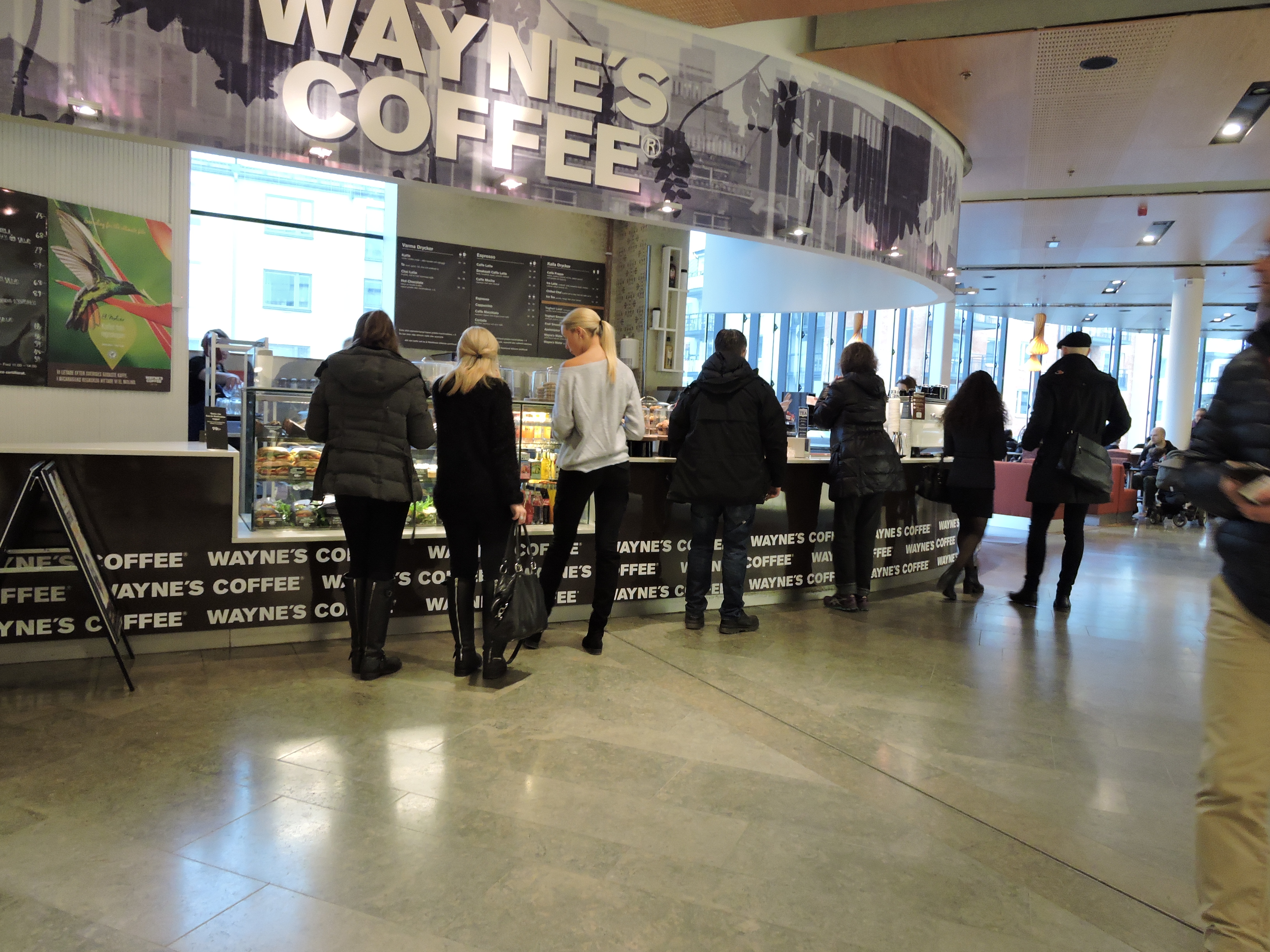En lagom kort kaffekö till ett ställe där ett annat elementärt behov tillfredsställs samtidigt med en kaffetår, elden