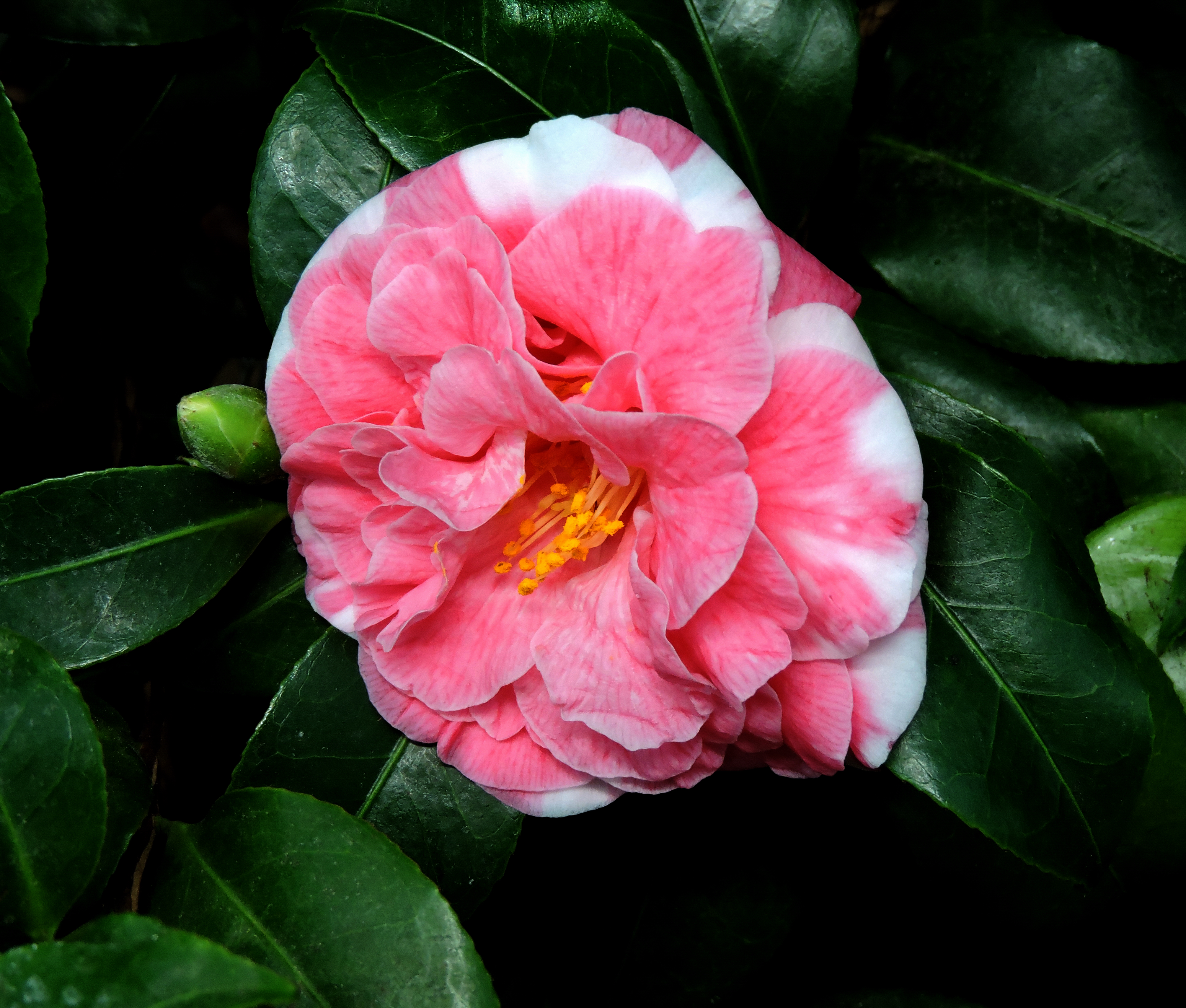 Kameliahäcken nära caféet var lägre än vanligt och blommade med varierande röda och rosa blommor.