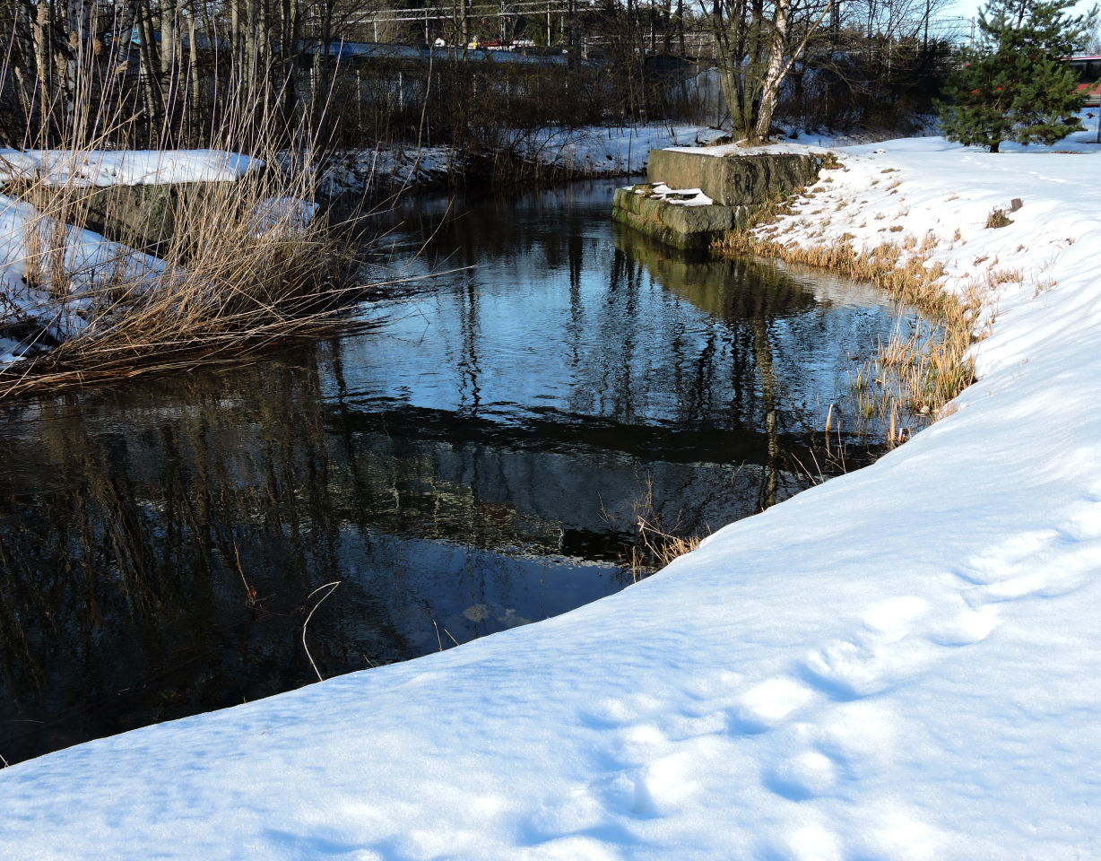 Mycket vatten i Väsbyån, allt skräp som legat samlat kring grenar och kanter har flutit undan och allt ser plötsligt så rent ut med snön som täcker kanterna.