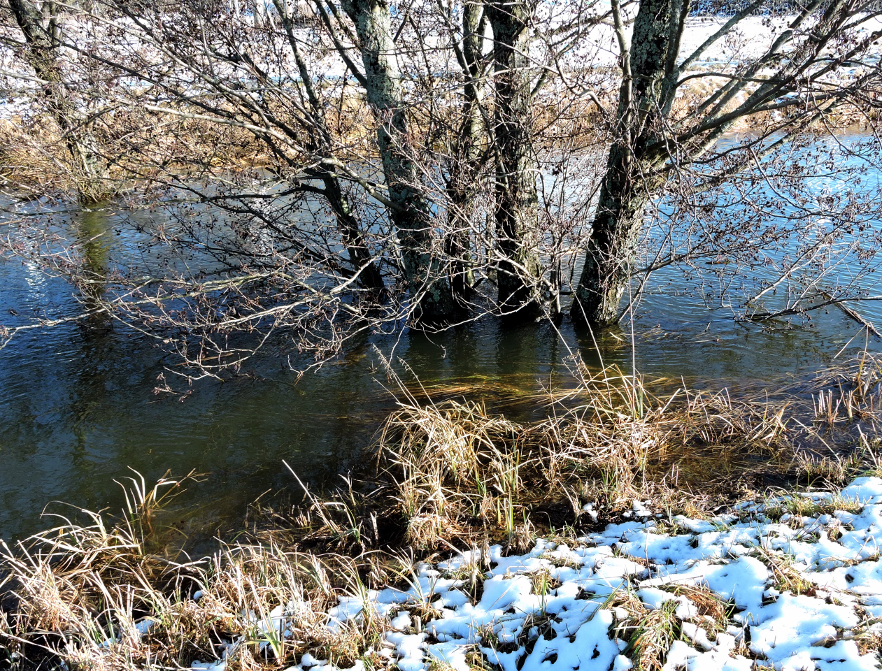 Sen snöade det i natt, marken var vit i morse och solen visade sig, jag måste fortsätta där jag slutade igår men idag är en annan dag. Vattnet hade stigit sedan igår och ån såg ut som en flod.