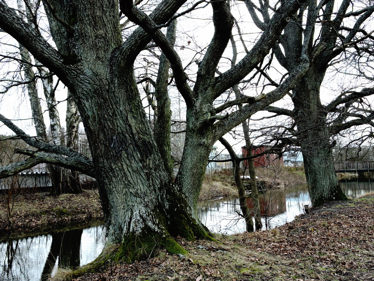 Igår var det en lite dyster dag, men jag tänkte se om isen smält bort på promenadvägen utmed ån. På vägen dit var gatorna helt öde, inte en bil eller människa syntes till och då jag kom ner till ån och ekraderna såg de lövtomma ekarna mer än mörka ut. Isen var kvar i skuggiga partier och jag hann knäppa ett par bilder sen kom den retsamma texten ”batteriet tomt”. Just som jag upptäckte en nypongren som böjde sig över vattnet och bildade en ring med sin spegelbild.