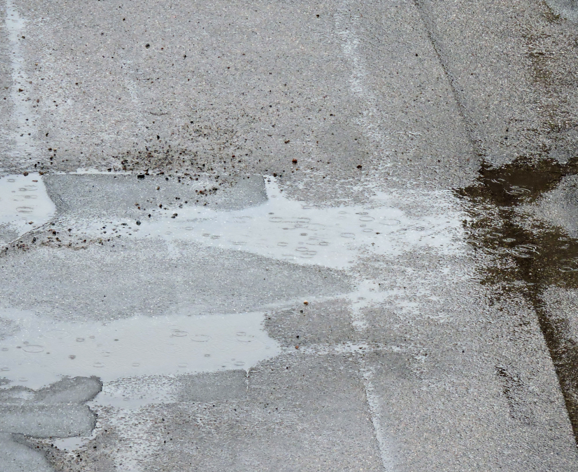 Pöl i den spruckna asfalten på parkeringen.