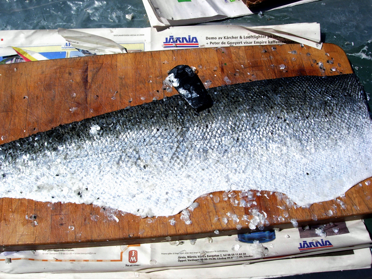 Så här kan ett laxskinn se ut när man börjar skrapa bort fjäll och sen ska köttrester och hinnor skrapas bort på andra sidan. Sen garvar man skinnet i en barklösning, vilken bark man använder betyder något för färgen på resultatet. Sälgbark är ju lättillgängligt nästan överallt och blir bra.