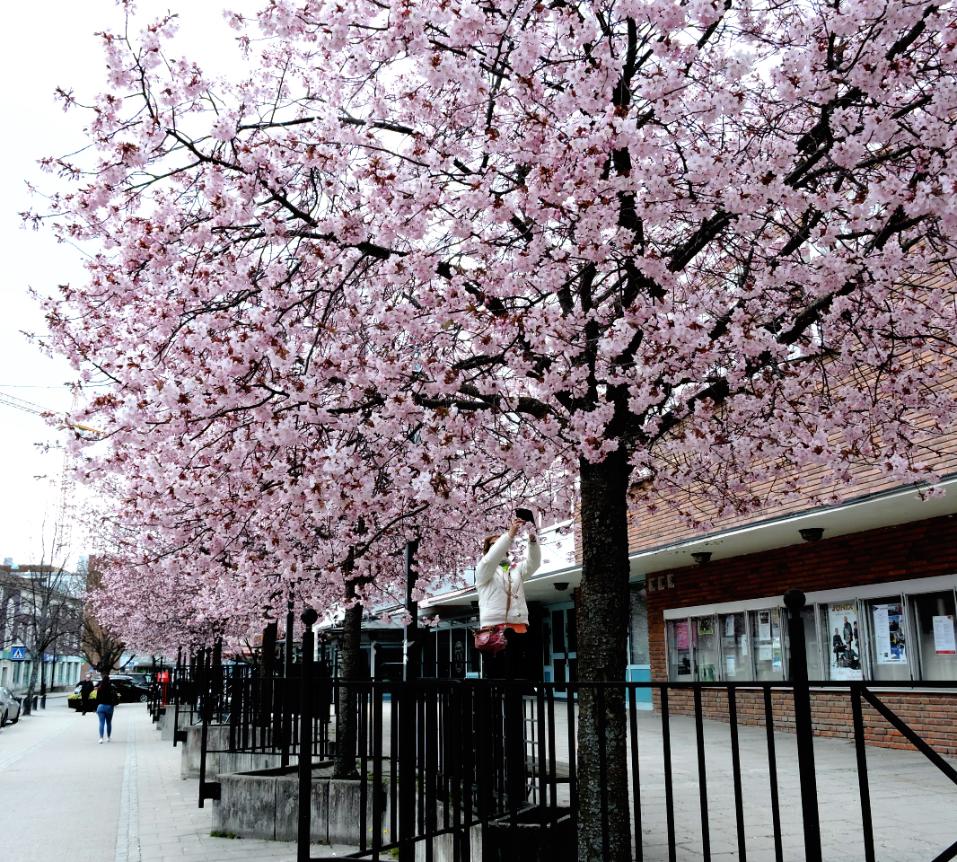 I år ville jag se det rosa molnet av körsbärsblom på nära håll och just nu blommar det som allra bäst utanför f.d. Folkets hus i Upplands Väsby. Här går man förbi utan att se märkbart berörd ut eller fikar under de blommande grenarna vid konditoriet.