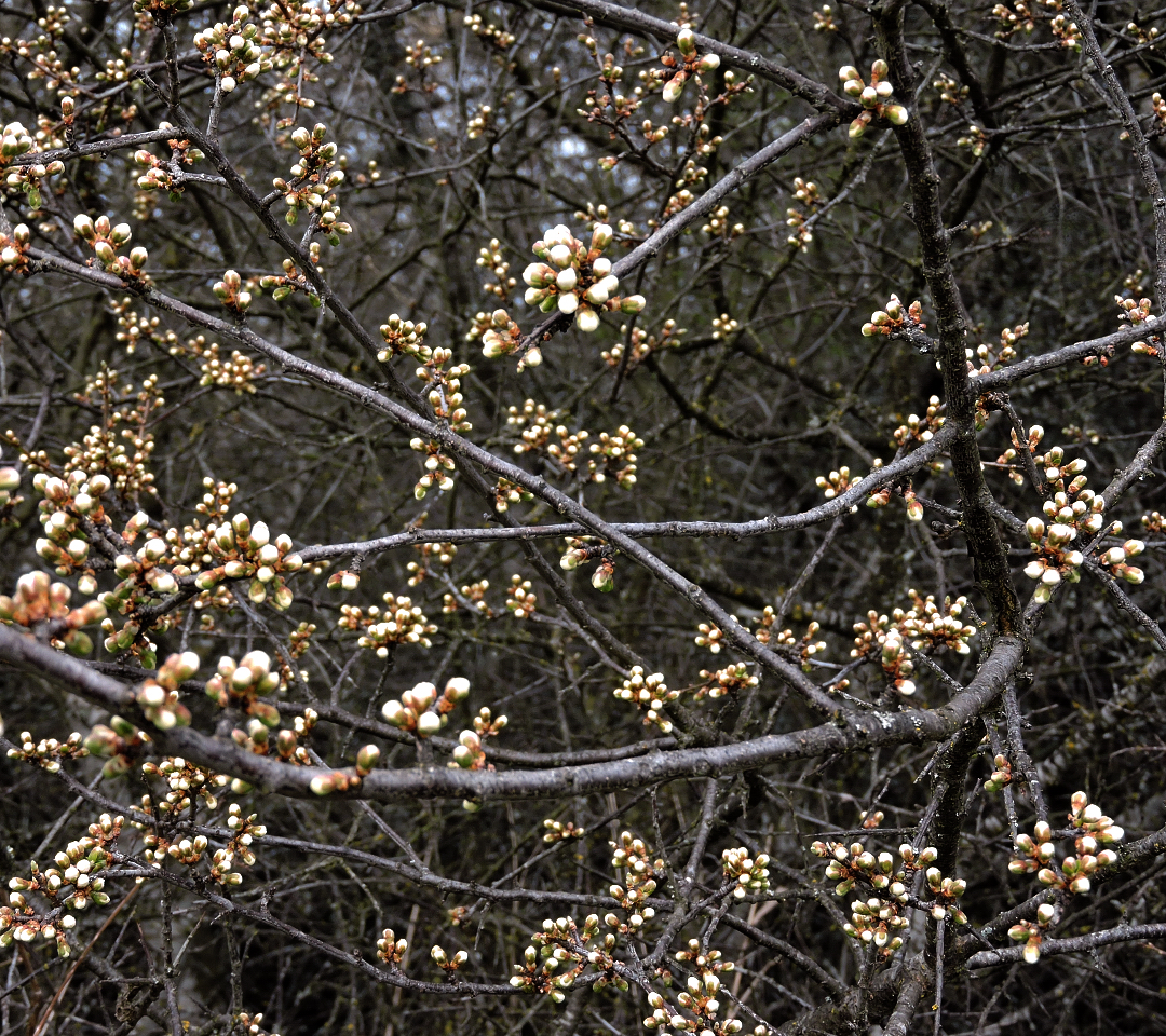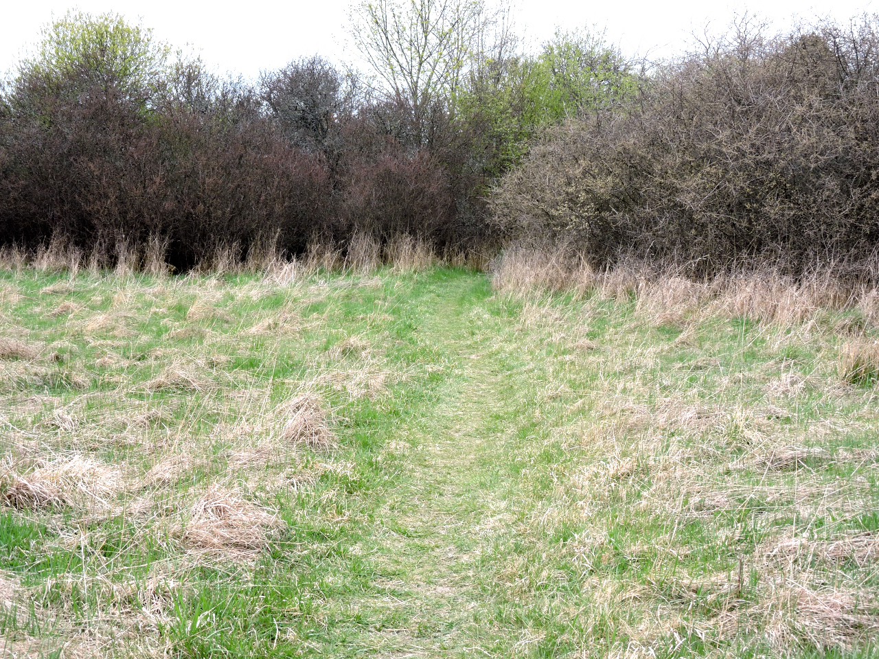 Vi går ut på stigen över åkern med sikte på hålet i slånbärssnåret och ser att slånen också är på väg att slå ut.