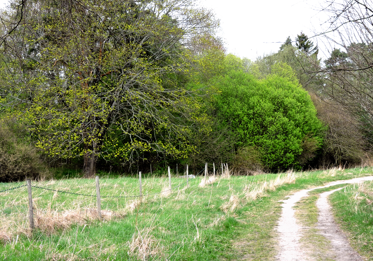 Nägot lyser knallgrönt i lövskogsranden, det är en hägg som redan har blad och vad är det för gula prickar i trädet framför?