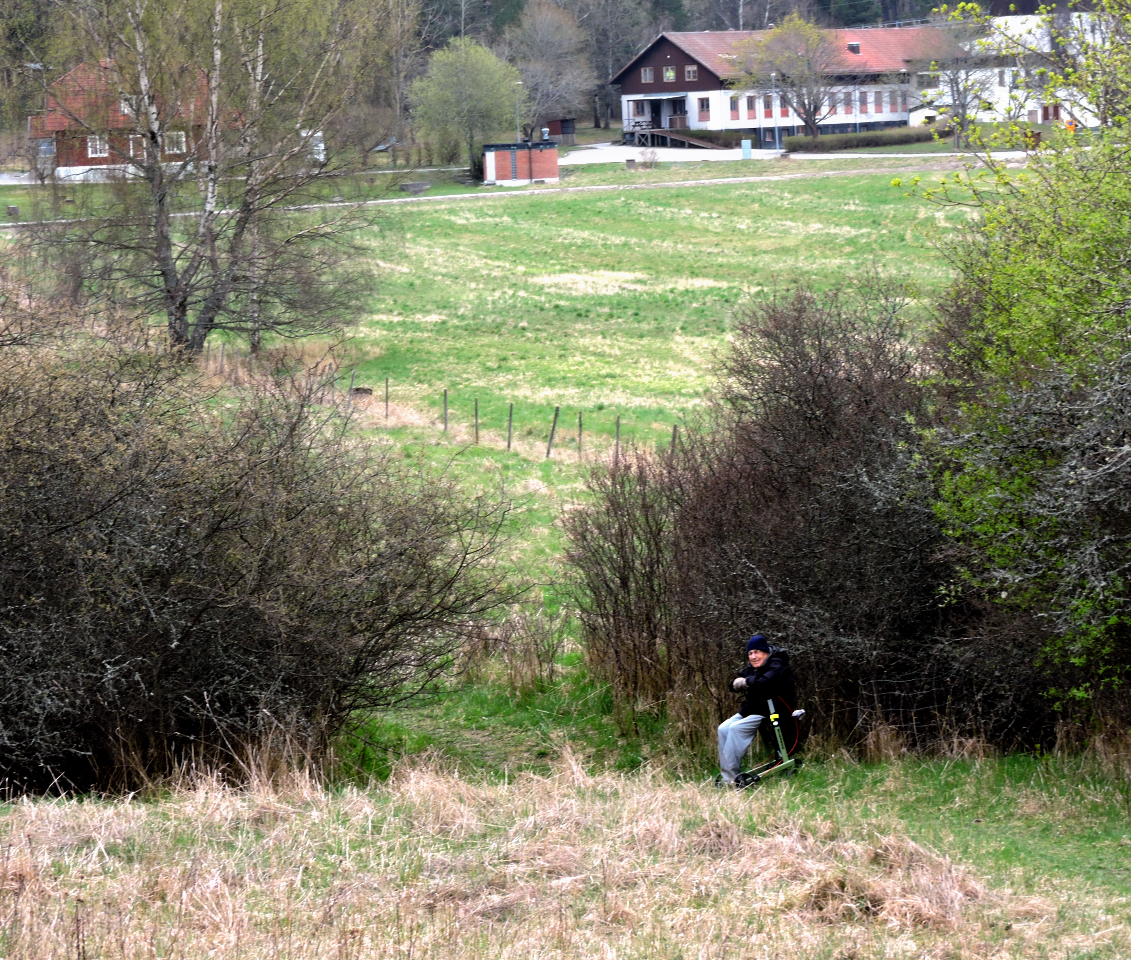 För att försäkra mej om att backsipporna finns kvar på en av kullarna i Calmare hage vid Fysingen åker vi till Löwenströmska och parkerar i vassviken bakom sjukhuset. Förra året, lite väl tidigt 4 april, var jag där och de pälsklädda sipporna hade knappt kommit upp. Vi har i år hunnit till slutet av april och Lasse är med, rullatorn är en begränsning för vandring på åkermark, men vi försöker.
