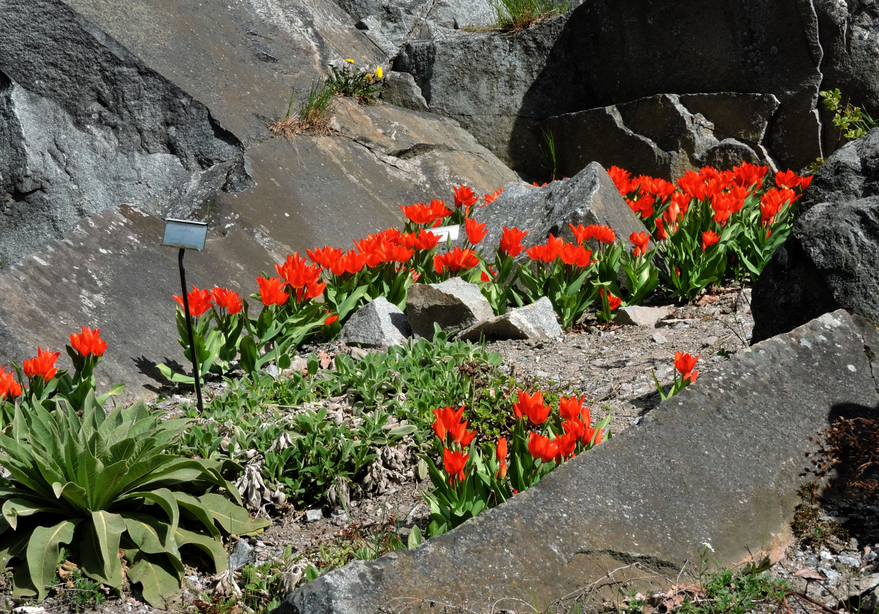 Brunnsviken in mot Roslagstull och Haga på motsatta sidan. En stilla värmande vårmåndag.Något eldrött skymtar fram från en klippskeva, tulpaner. Nådde inte upp för att läsa namnet på skylten.