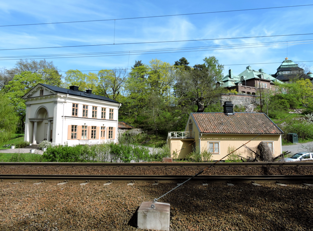 Vi går över Roslagsbanan och ser bättre från vägen utmed klippväggen hur husen vid Villa Frescati ligger.Villa Frescati, Edwalls tandläkeri och VetenskapsakademinRoslagsbanan, Villa Frescati, Armfeldts stuga och på höjden bakom, Vetenskapsakademin.