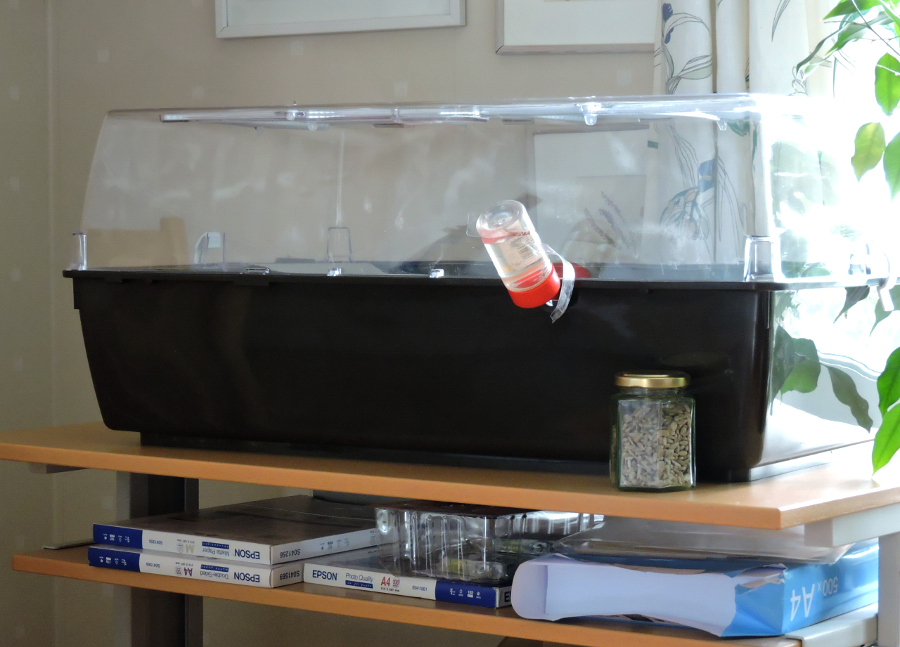 Det gamla datorbordet från en annan tids datorer är lagom högt för att man ska få ögonkontakt med de svartögda skönheterna, så där får lådan stå. Nära fönstret men inte i direkt solljus.