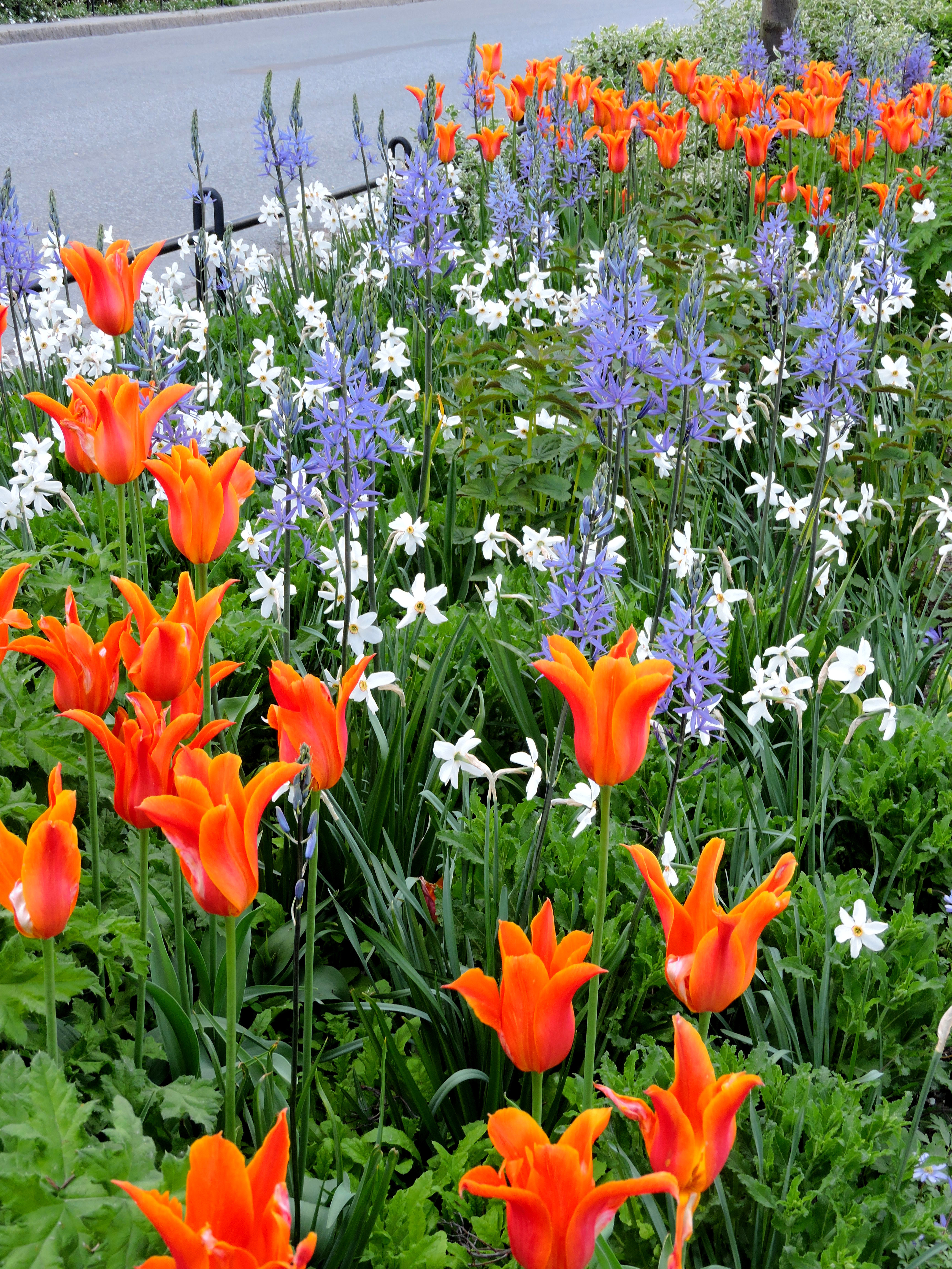 Gaturabatt bFör oss är det nytt att man lagt ner möda på att variera lökväxterna och det är lite spännande att se vad  som kommer härnäst.Gaturabatt cStora rödlila bollökar har sträckt sig uppåt och hinner precis lagom veckla ut sig innan de lila tulpanerna ger upp.