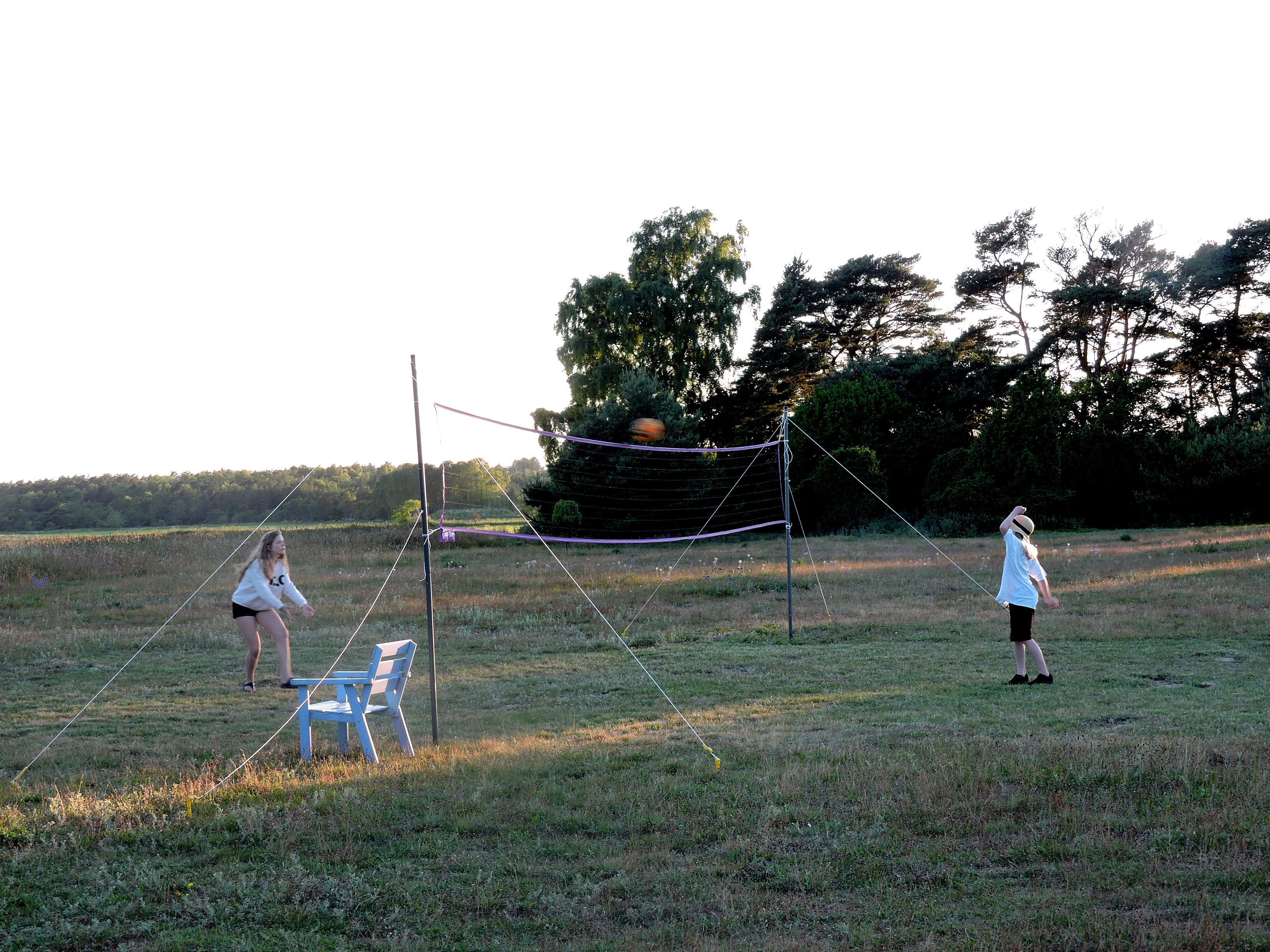 Ett wolleybollnät växte upp på tomten när Alexandra och Alfred kom och i skuggan av den sjunkande solkulan har barnen ännu kraft kvar att springa runt och jaga bollen.