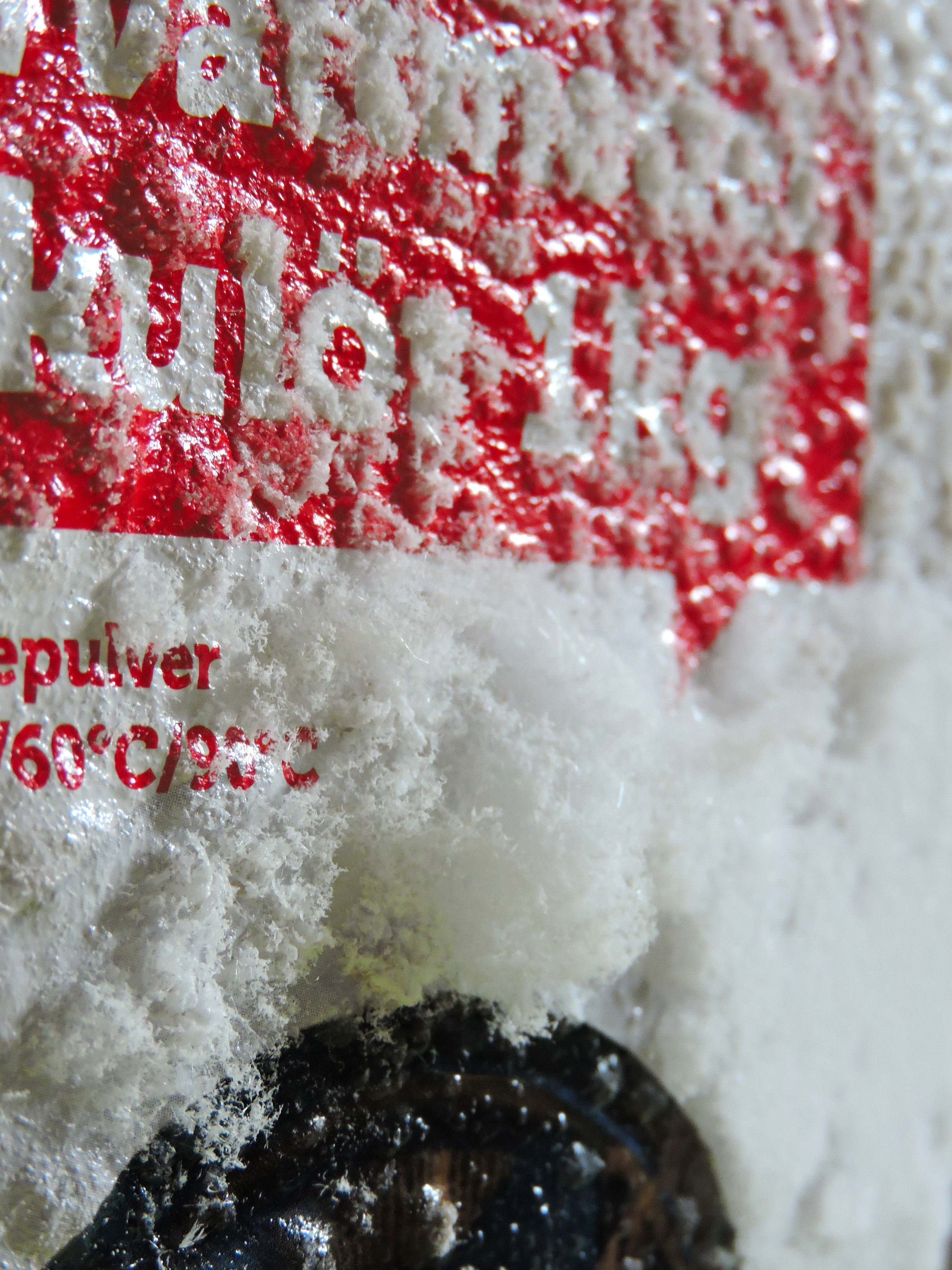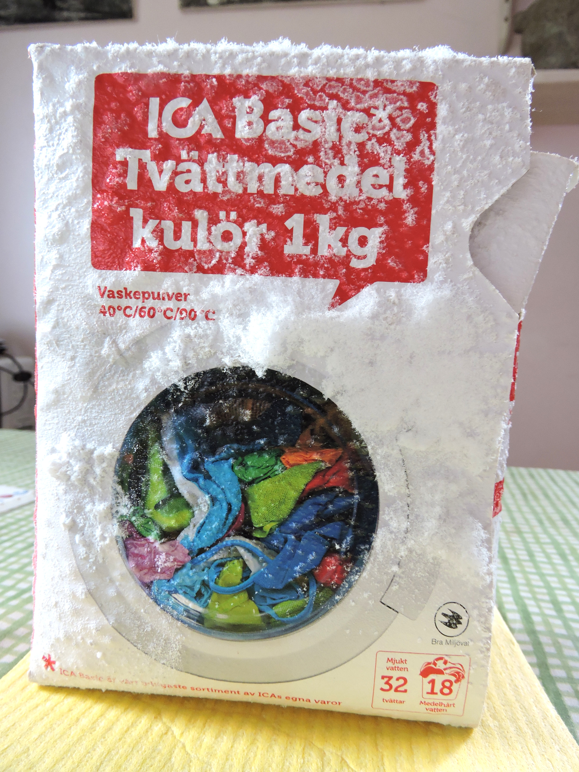 Så här kan ett tvättmedelspaket se ut om det får stå i ett skåp i tvättrummet över vintern.