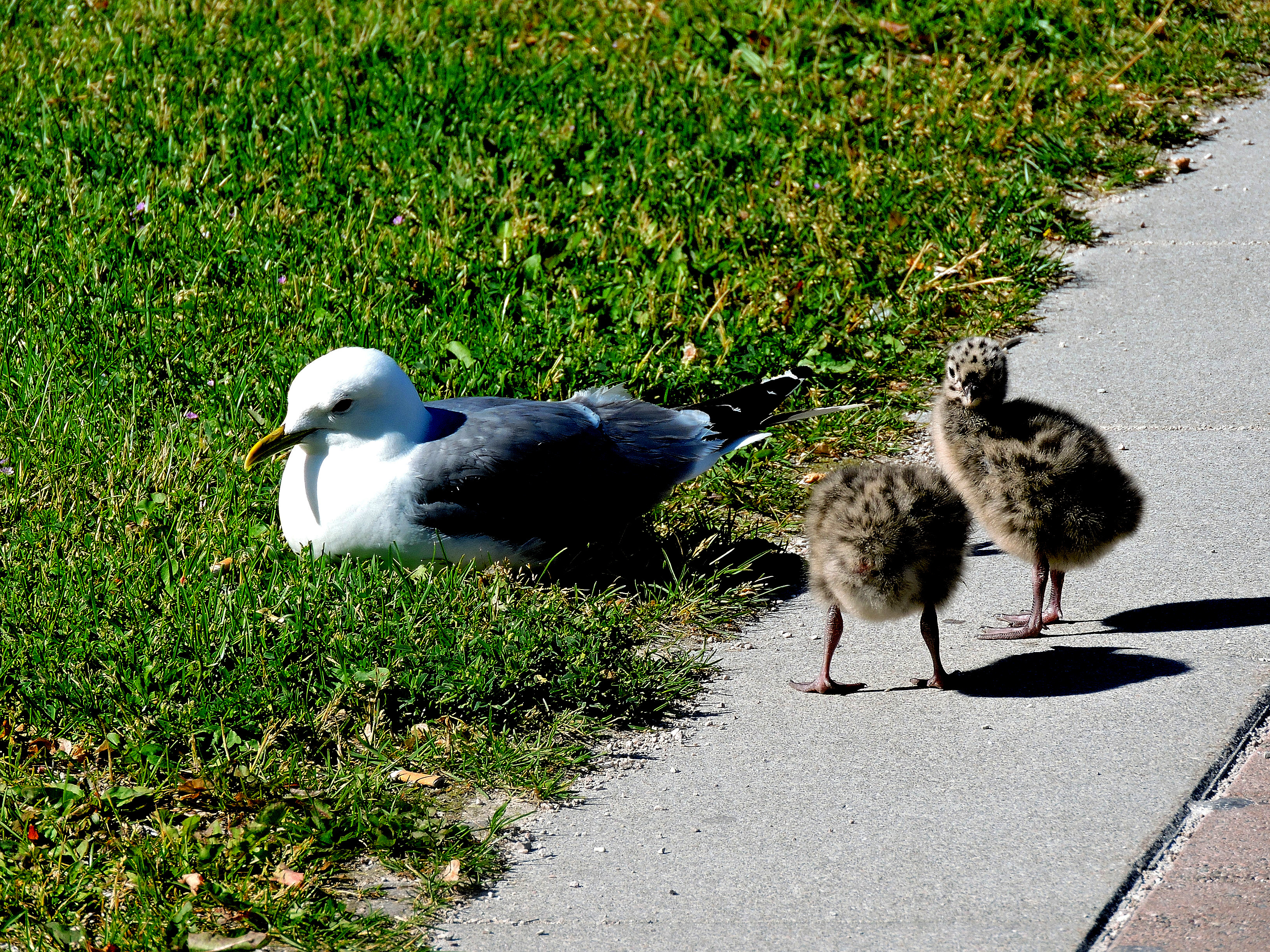De här måsungarna gick omkring ensamma på trottoaren utanför huvudingången till Visby Lasarett. Efter en stund såg jag att mamman satt i en lyktstolpe några meter därifrån. Stranden är på andra sidan byggnaden så de hade väl bara tagit en promenad kring huset. En familj med flera ungdomar fick syn på dem och tänkte inte svänga undan och då kom mamman dykande mot huvudet på den längste och de tog en stor sväng ut på gatan.