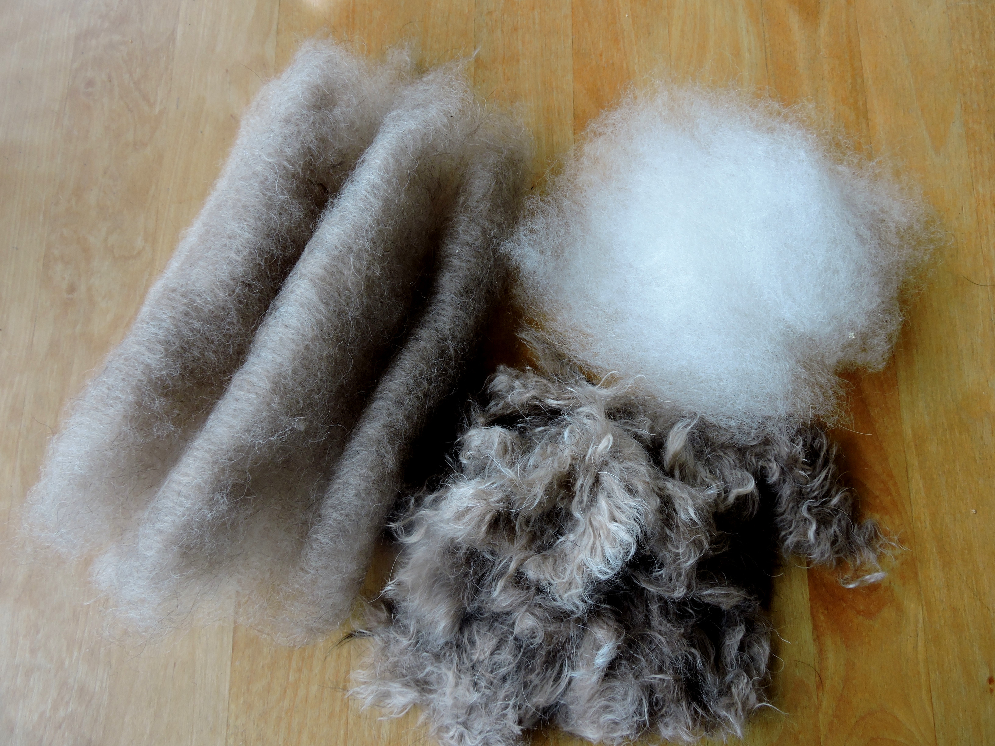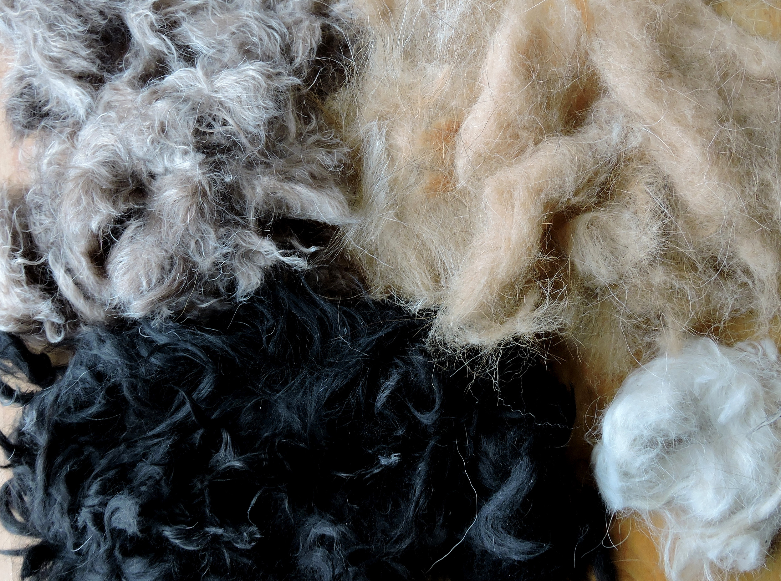 Av en en händelse fick Karin kontakt med en hundtrimmare och beskrev behovet. En stor påse med hår från ett antal olika hundraser blev resultatet och den påsen arbetar vi oss nu igenom. Alla hundhår är inte mjuka och formbara men fler än man tror kan, om man blandar in lite finull från får, bli trevliga garner, som inte sticks eller kliar.