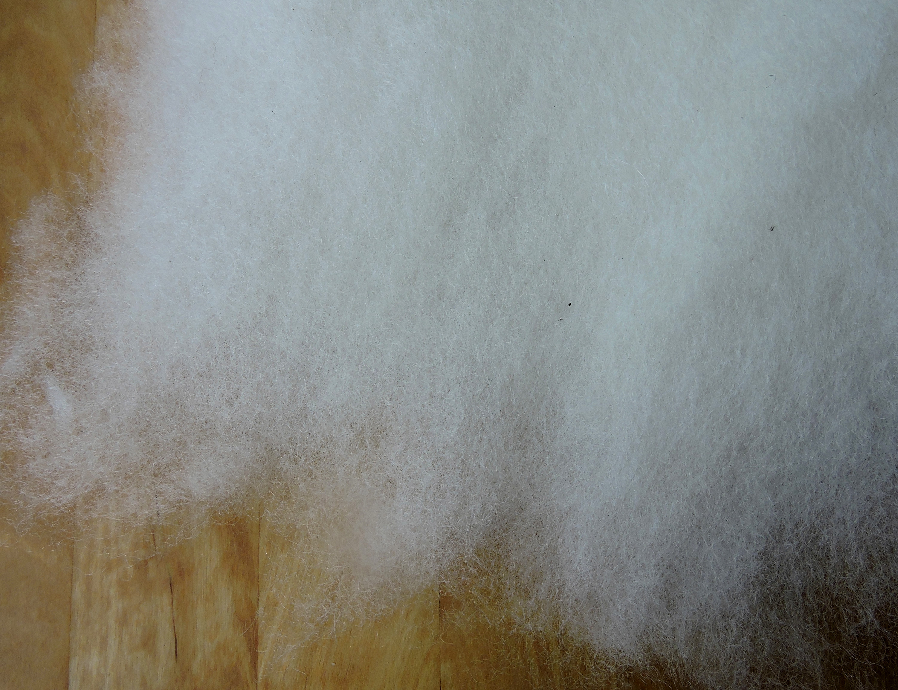 Sen for vi till spinneriet i Fardhem och köpte kardflor av finull. Lätt mjukt och blankt som ett sommarmoln. En liten mängd finull och en större mängd hundull i kardan blandas till vanliga kardrullar, finullen gör garnet mindre kompakt.